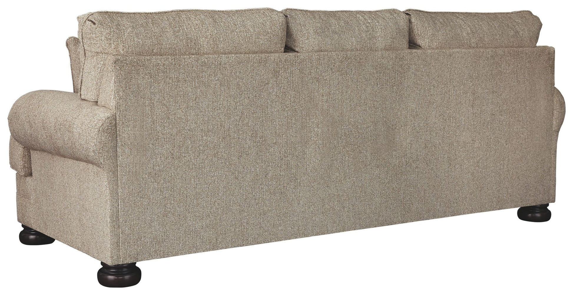 This sumptuously styled sofa proves that a richly traditional look doesn’t have to break the bank. Flared effect gives the classic roll arms a relaxed feel, while the choice of a plush chenille upholstery in oatmeal is earthy elegance at its best. Distinctively turned bun feet in a dark finish add to the sofa's substantial presence.