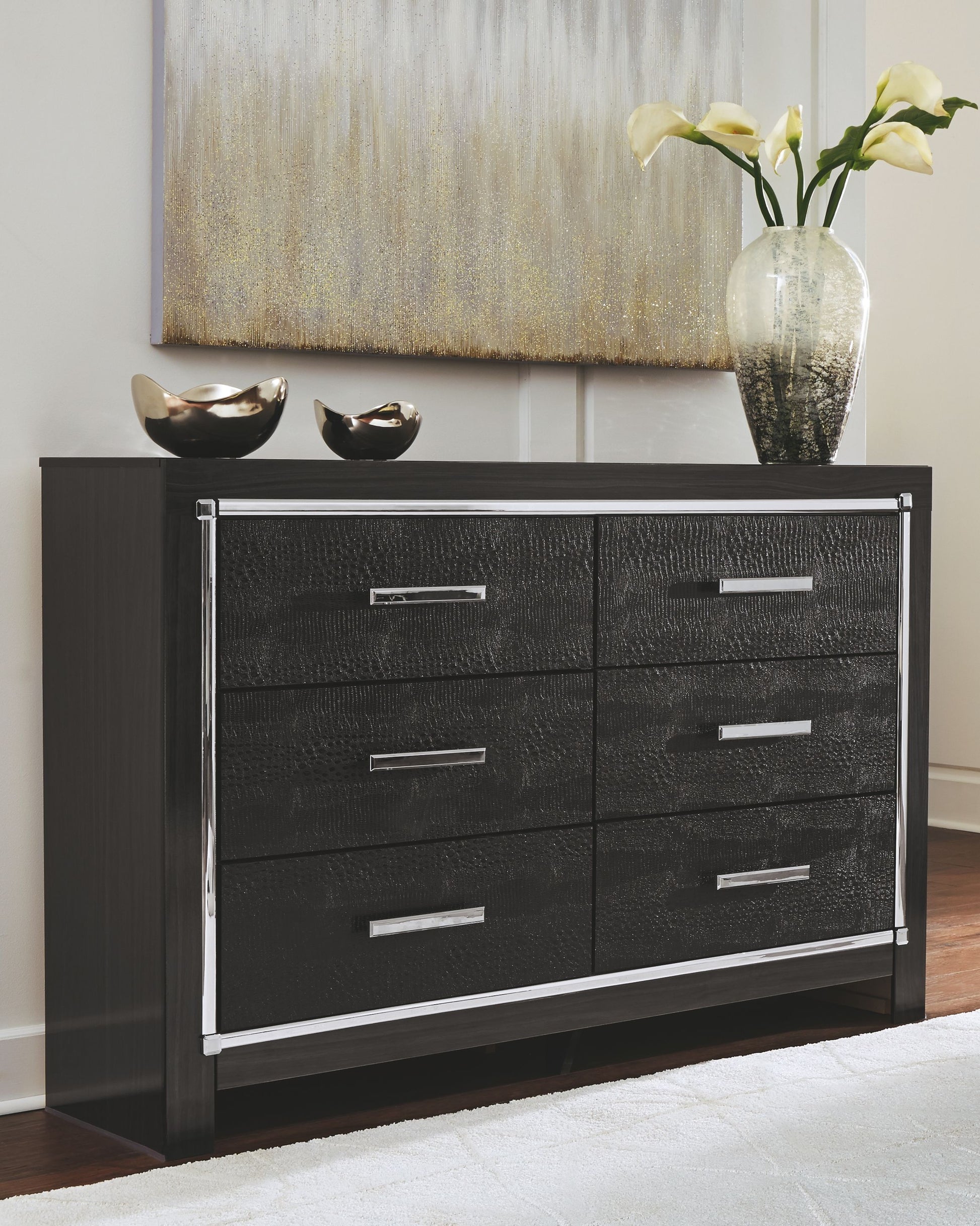 Kaydell - Black - 6 Pc. - Dresser, Mirror, Chest, King Upholstered Glitter Panel Storage Bed