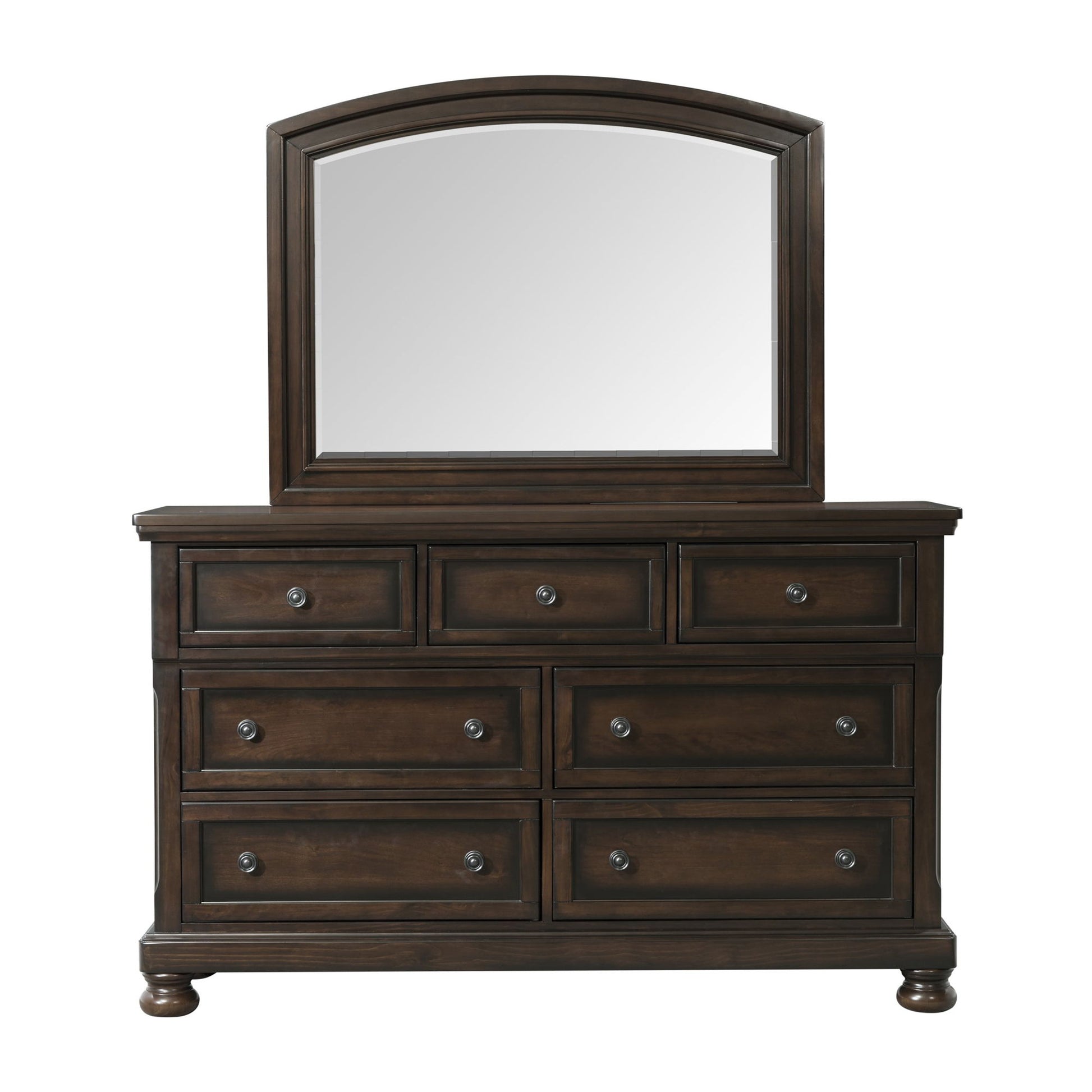 The Dresser & Mirror Set is traditional in design and provides plenty of drawer space. The dresser features seven spacious drawers, and one hidden in the top middle. An arched, bevel edge mirror completes this set.