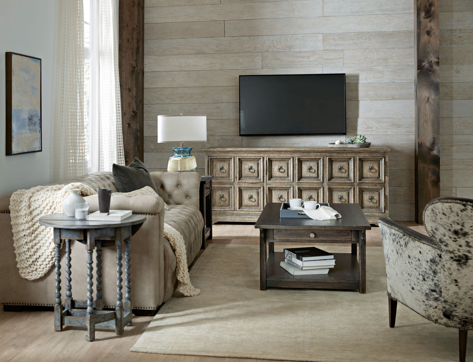 With chic curvy legs and a chunky base, the Prause Gate Leg Table is reminiscent of European antiques brought to this country by immigrants during the time of America's westward expansion. This character-filled piece is also practical. Put the drop leaves down for a snug fit next to the sofa, but raise them up to use this piece for an extra table top or serving surface. Finished in the dreamy Blue Bonnet, a soft blue accent finish with a rubbed patina and distressing. Taking the next step in creating a Hill Country family of collections, Hooker Furniture has introduced LaGrange. The anthology of bedroom, living room, dining room, occasional and home office furniture is inspired by the Hill Country region of Texas, including the town of LaGrange, one of the stops made by the Hooker Furniture design team in search of inspiration. The collection includes heavily distressed oak and hickory surfaces, extensive carving and scroll work, aged metals, sedimentary stone and primitive textiles. Each piece has a unique story to tell, while still retaining the authentic American character of the original collection. LaGrange is updated with a fresh new personality, brought to life by four distinctive finishes and modern conveniences for the lifestyles of today.