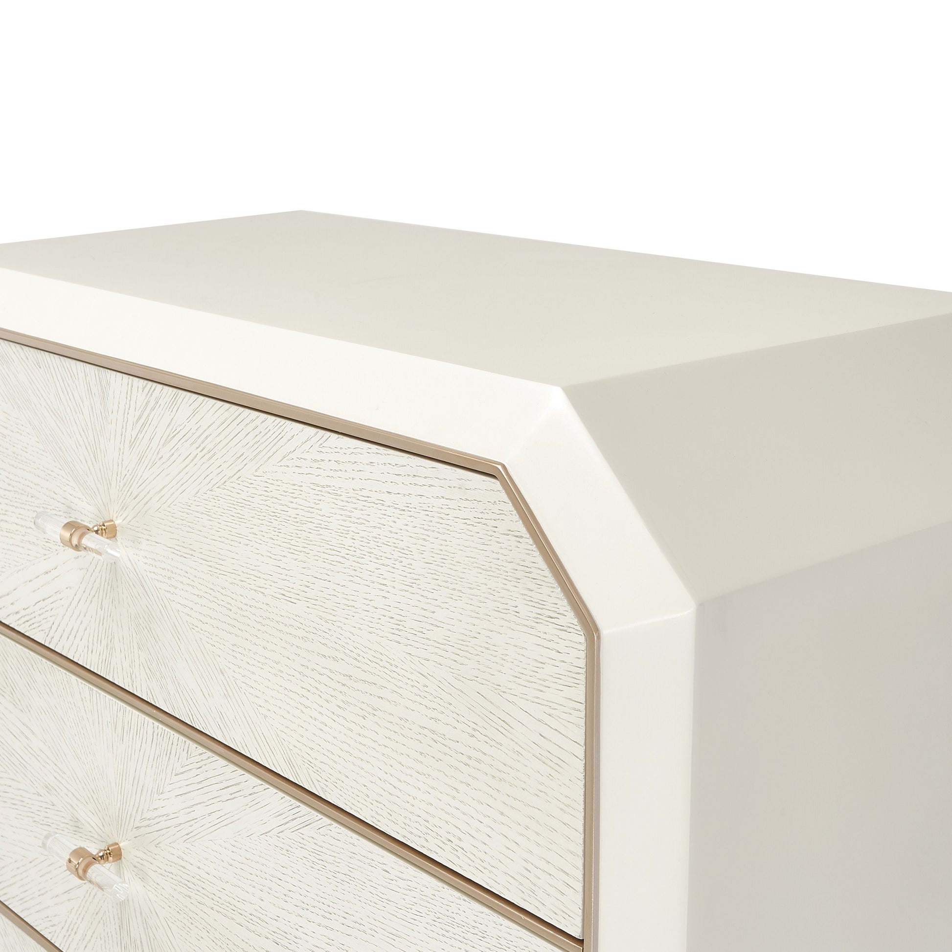 Complete your bedroom look to perfection! The La Rachelle Chest is more than storage, with a stunning starburst veneer pattern and the collection’s signature clipped corners. Top it off with your favorite modern decor, and let your style glow!