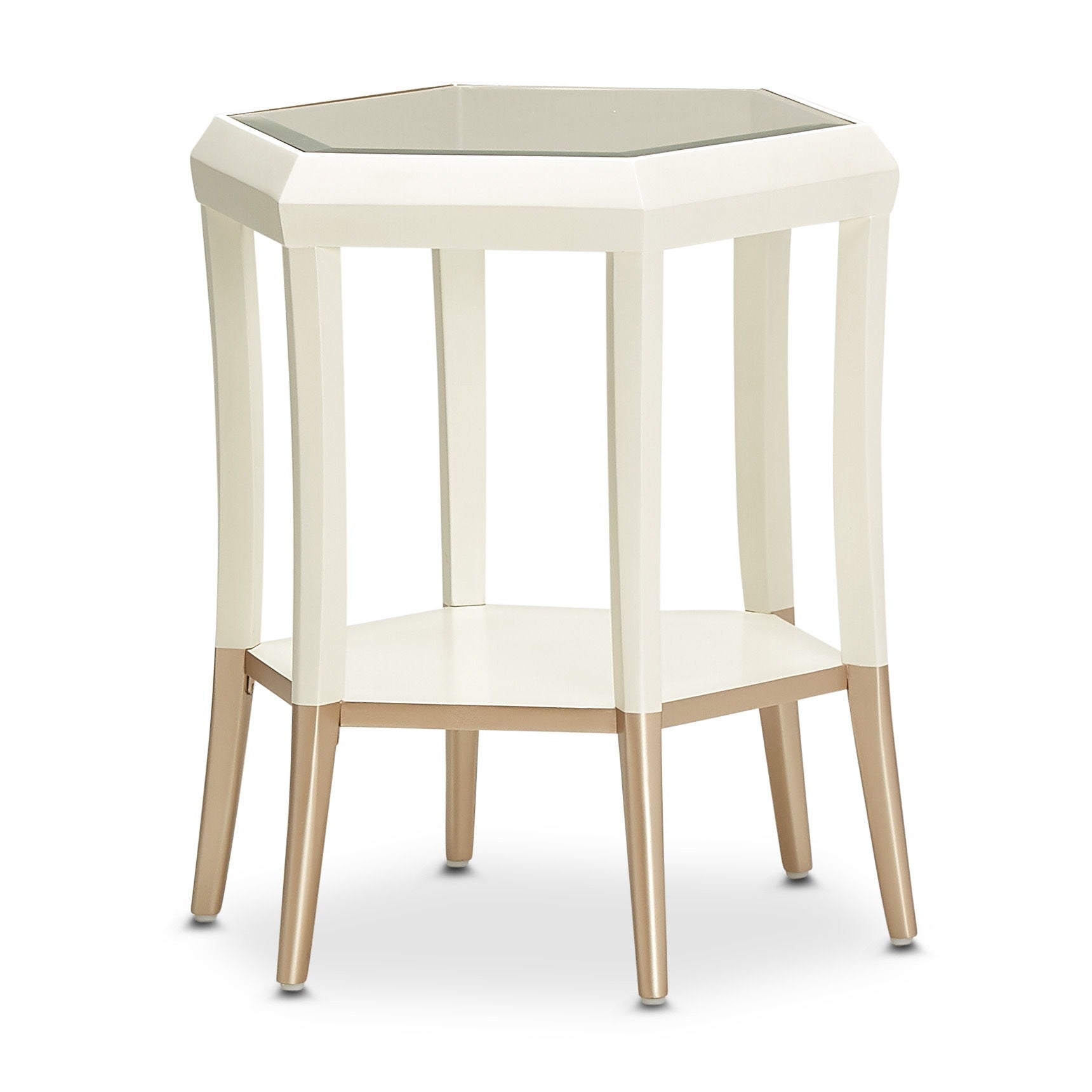 Show off your angles! The La Rachelle Hexagon Cocktail Table is cut into a gemstone shape with a pearly finish, Champagne accents, and the perfect style to elevate your living room look.