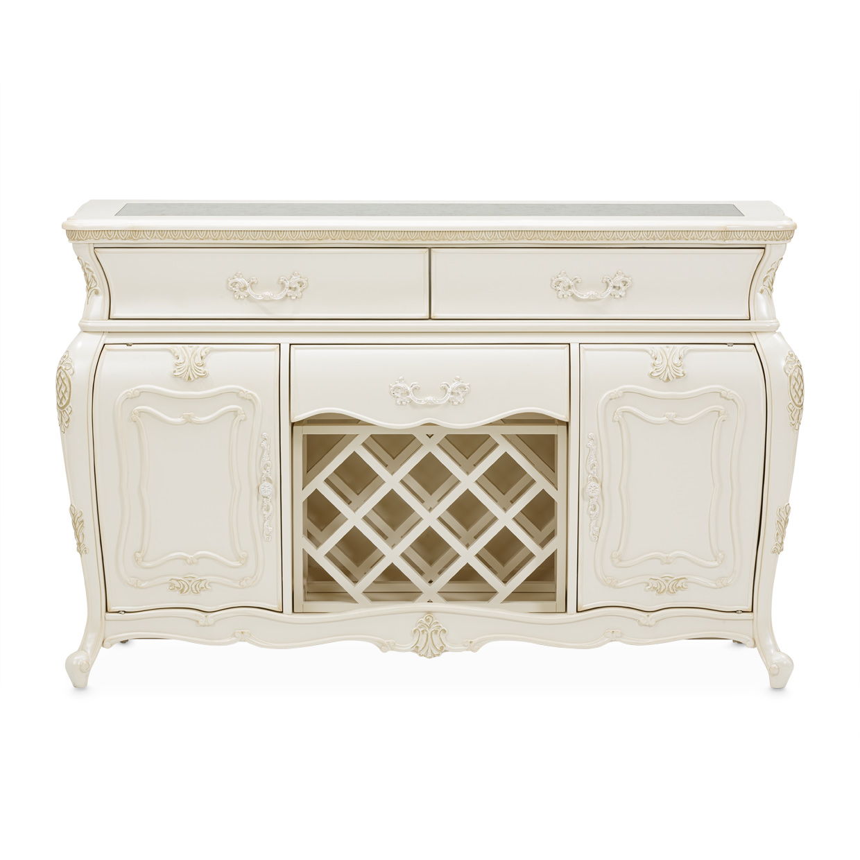 A beautiful must-have for any classic home, the Lavelle Sideboard in Classic Pearl is gracefully shaped and adorned with molding accents and antique hardware. Two doors, three drawers and an open wine rack provide plenty of space for all of your storage needs.