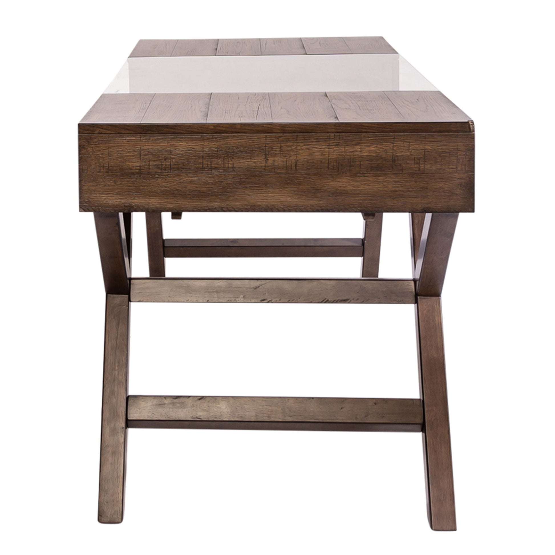 Work from home or the office in comfort and style with the Lennox writing desk. Crafted of rubberwood solids with split heart white oak veneers, this piece features a weathered chestnut finish, accented with pewter bar pull hardware. The floating tempered glass insert adds a unique design appeal with a storage shelf beneath. There are two full extension drawers for extra storage, all anchored by a tapered leg design. Reinvent your style with this memorable piece.