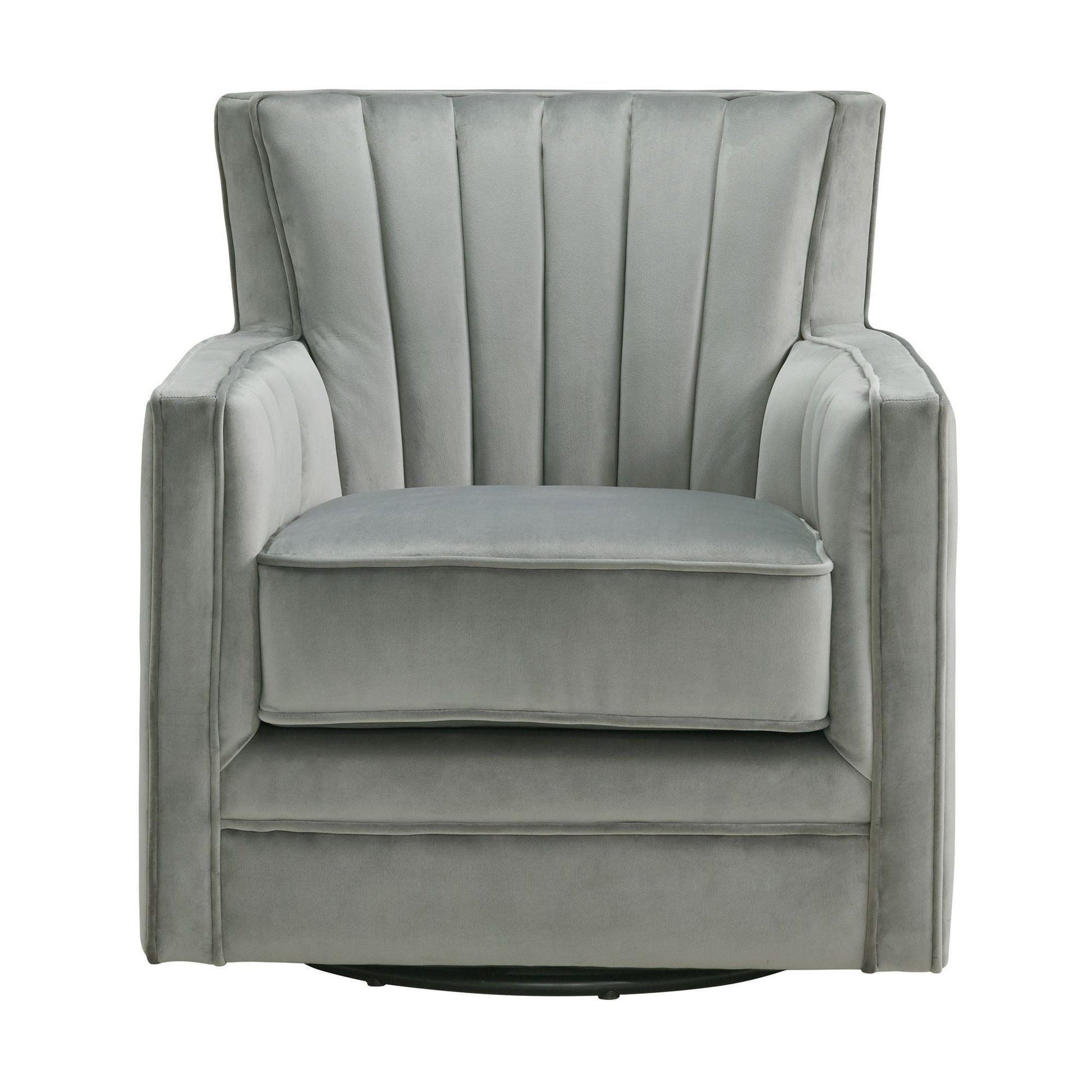 Featuring a modern design with soft, velvet-like upholstery and channel back detailing, this accent chair is the epitome of elegance and simplicity. It is constructed with solid wood and plywood for sturdiness and features a swivel base, making it easy to join any conversation. Just choose the right hue and see it become an instant statement piece in your beautiful space.