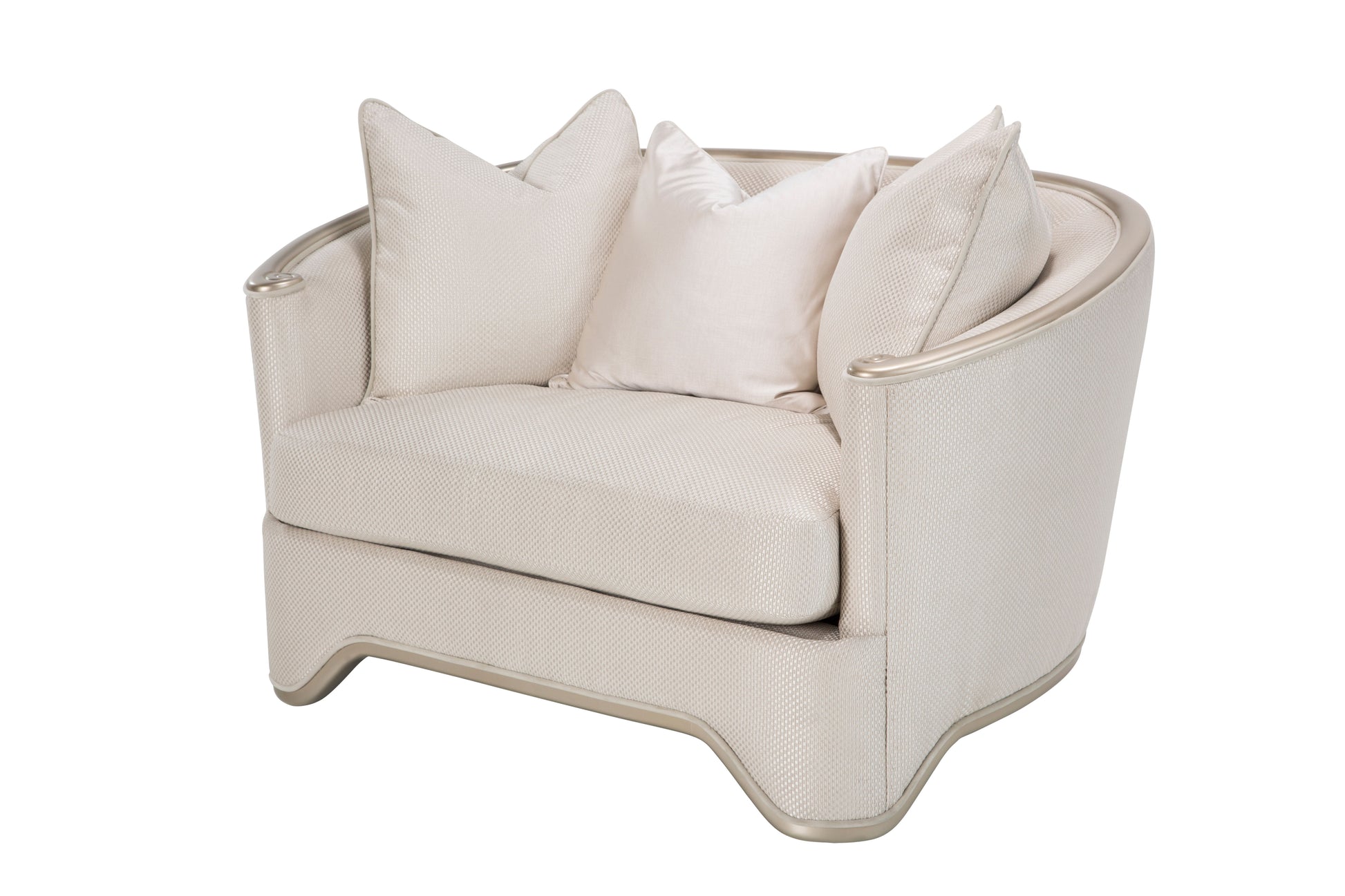 - Chair cushion and body are upholstered in a champagne fabric the emulates raw woven silk