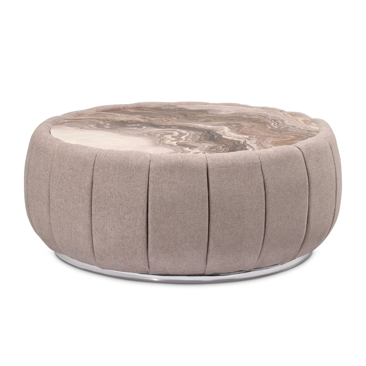 The Lucca Cocktail Table exudes understated luxury. Its round silhouette is elegantly dressed in a soft, channeled woven fabric, creating a warm juxtaposition with the sleek faux marble top. Nestled on a narrow silver base, it's a striking conversation starter, serving sophistication with every pour.