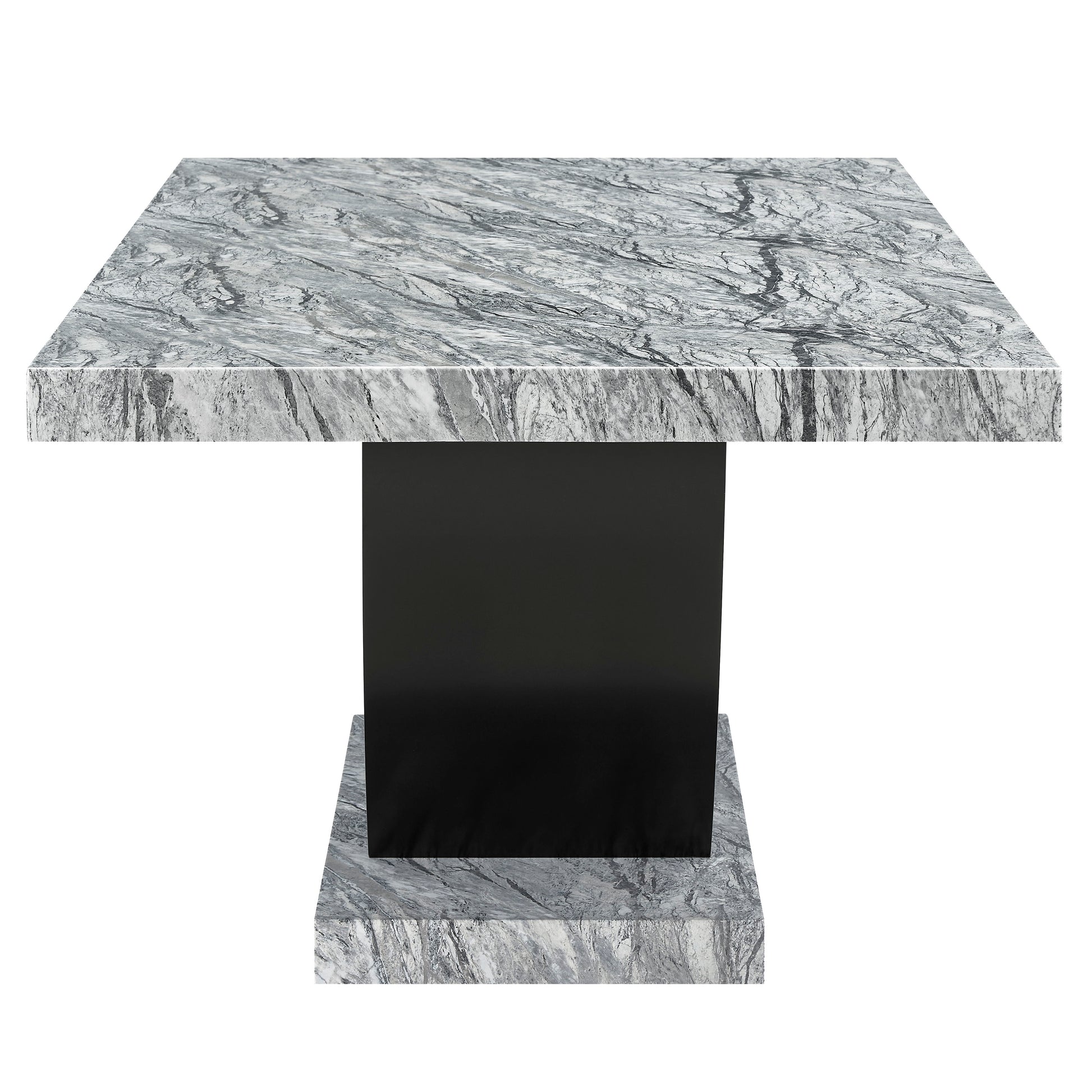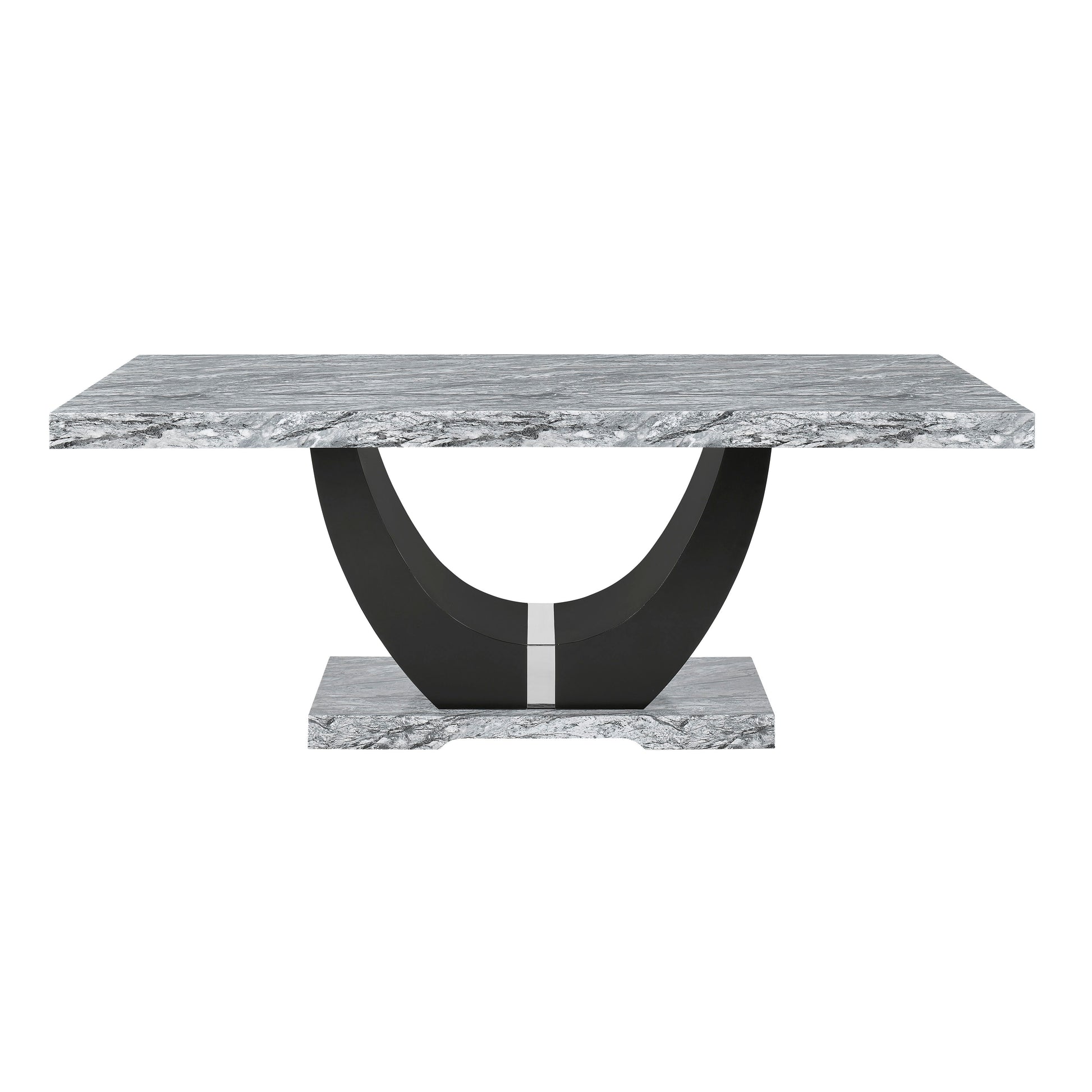 Transform your dining space with the Lyra Faux Marble Table, a blend of contemporary glam and practical design. This stunning table features a gray and black faux marble top that creates a striking contrast with its solid black U-shaped pedestal base. Constructed from a combination of solid and manufactured woods, this table is built for longevity. The faux marble surface not only adds a touch of luxury but also resists water and is easy to clean, ensuring low maintenance. Add the Lyra Faux Marble Table to your home for a dining experience that combines elegance, durability, and convenience.