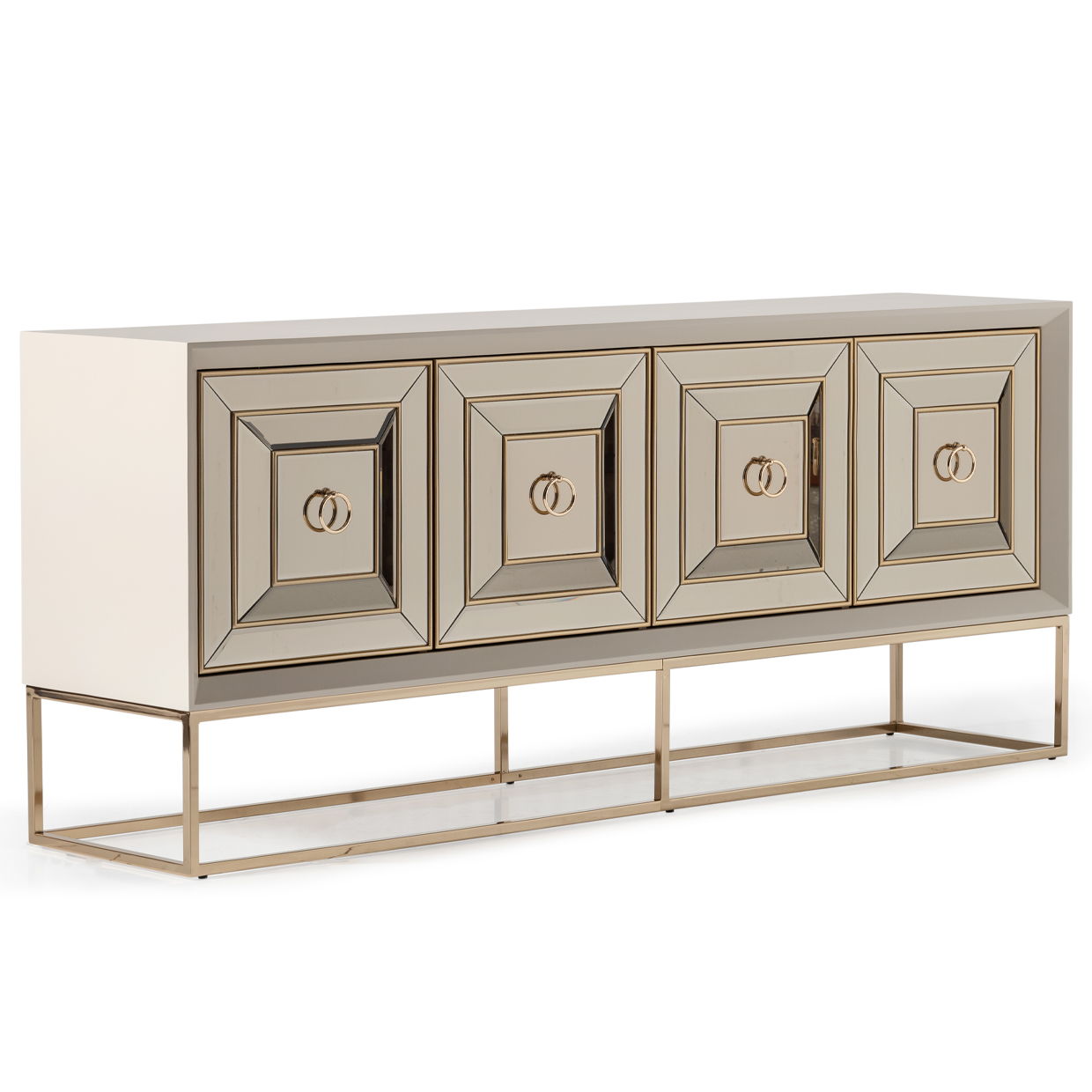 Immerse in the allure of the Madison Console. Adorned with four doors and captivating ringed handles, it perches on slender legs, whispering tales of hidden treasures.