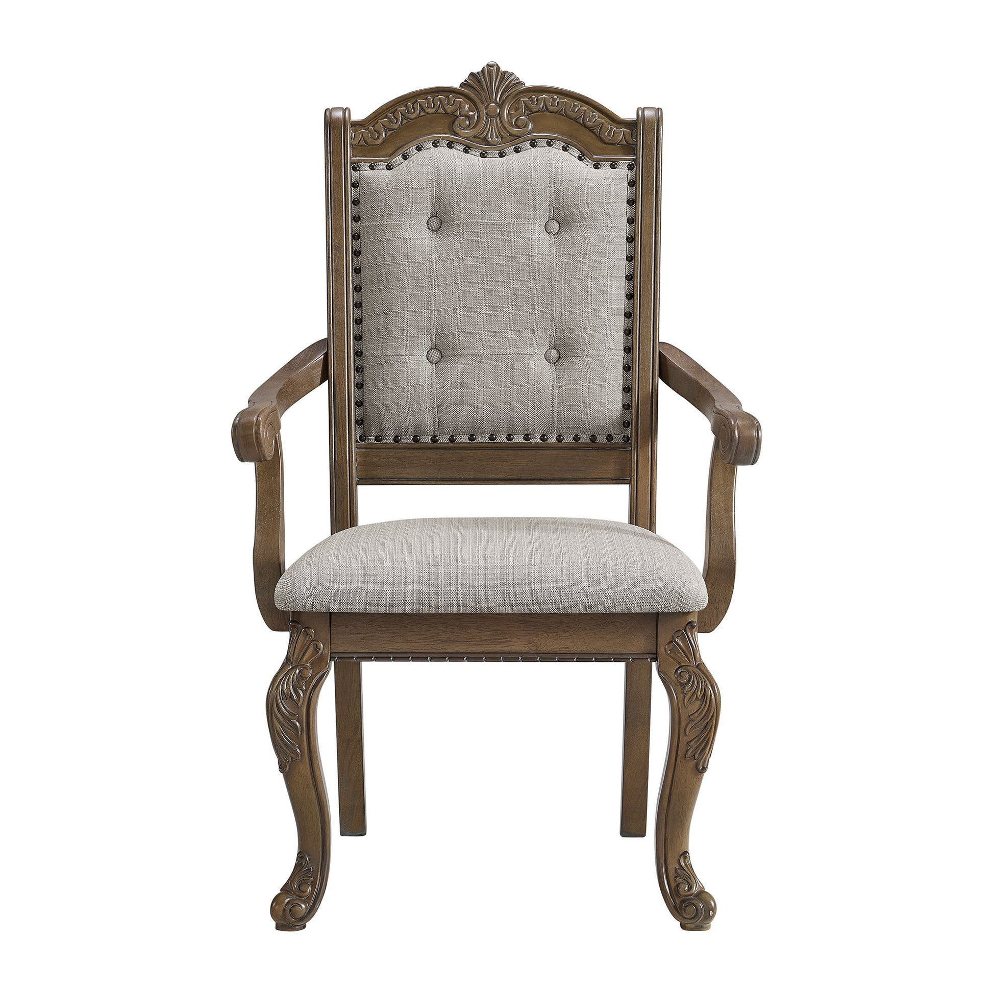 The Madison Park Arm Chair epitomizes elegance with its rich walnut finish, infusing warmth and sophistication into any dining space. Ornate carvings throughout the chair exude timeless charm, while silver nailhead trim on the chair back adds refined elegance and a touch of luxury. Carved arms and legs showcase intricate beauty, enhancing its classic appeal. Upholstered in tufted beige fabric, the chair offers a plush and inviting feel, ensuring comfort during meals and gatherings. With its traditional design that never goes out of style, the Madison Park Side Chair is a perfect blend of timeless beauty and functional comfort for your dining room.