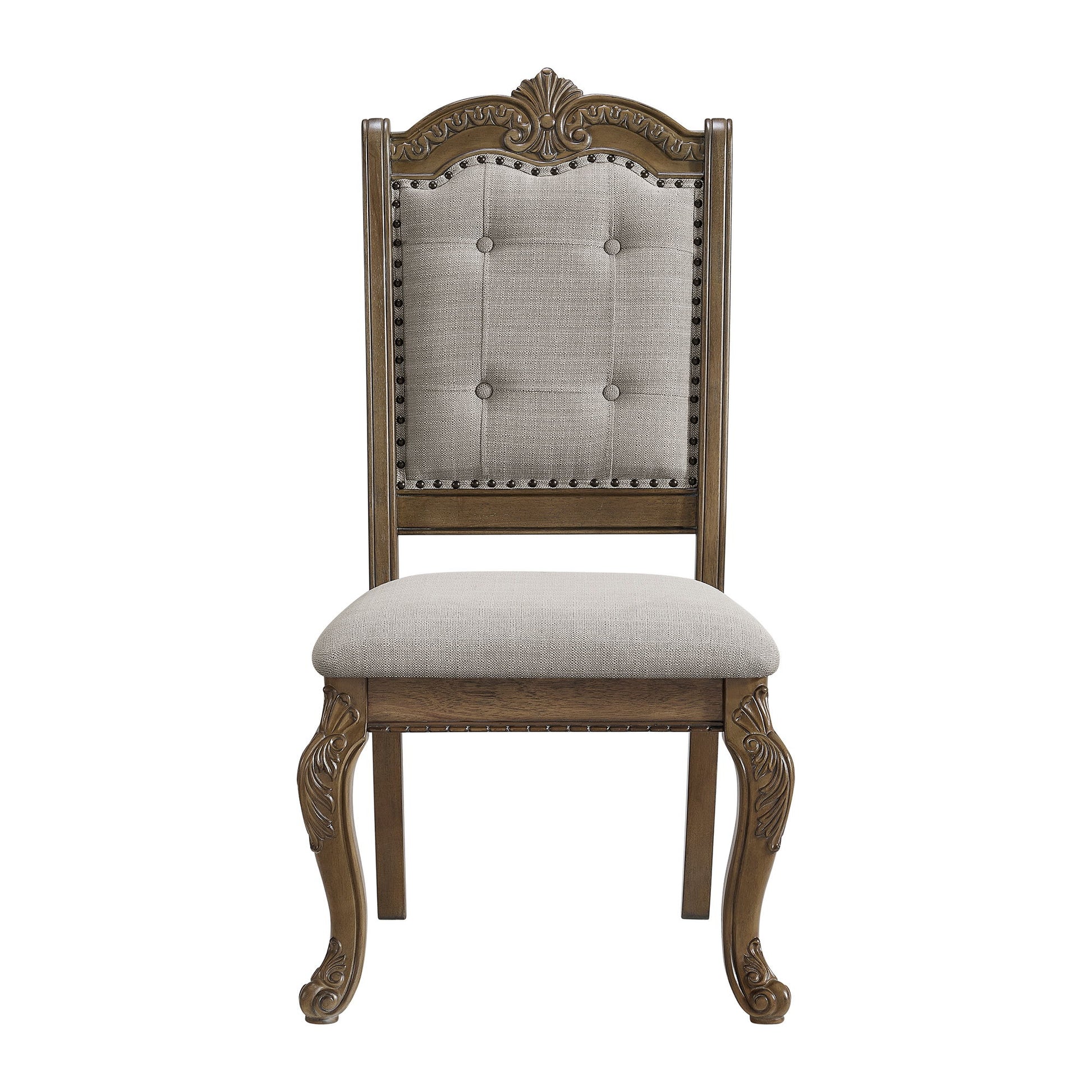 The Madison Park Side Chair epitomizes elegance with its rich walnut finish, infusing warmth and sophistication into any dining space. Ornate carvings throughout the chair exude timeless charm, while silver nailhead trim on the chair back adds refined elegance and a touch of luxury. Carved legs showcase intricate beauty, enhancing its classic appeal. Upholstered in tufted beige fabric, the chair offers a plush and inviting feel, ensuring comfort during meals and gatherings. With its traditional design that never goes out of style, the Madison Park Side Chair is a perfect blend of timeless beauty and functional comfort for your dining room.