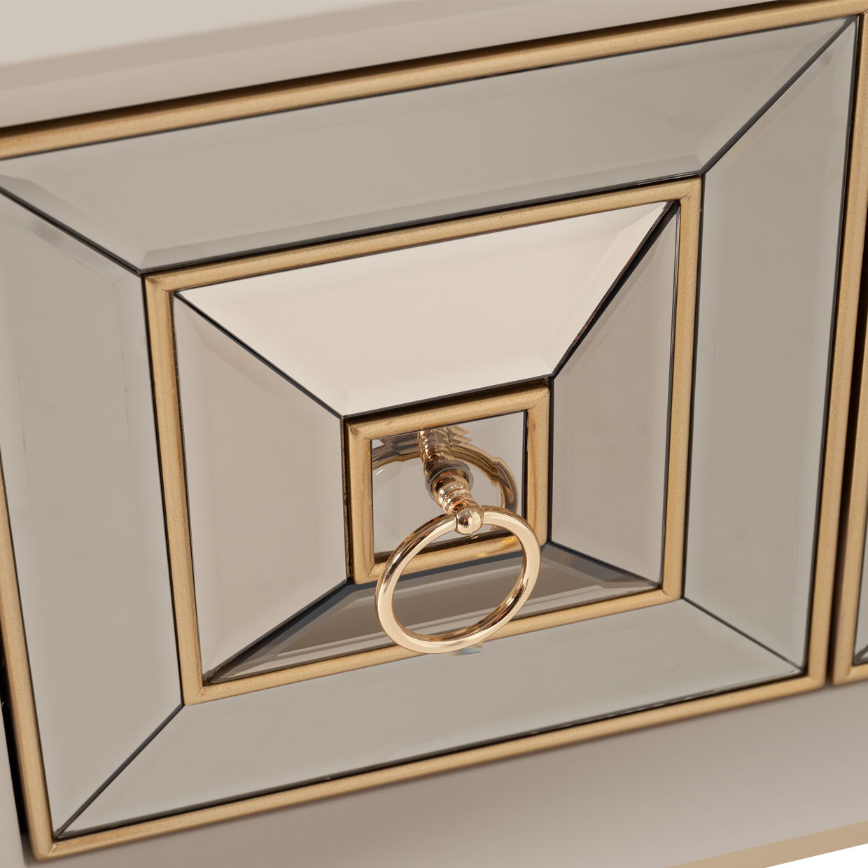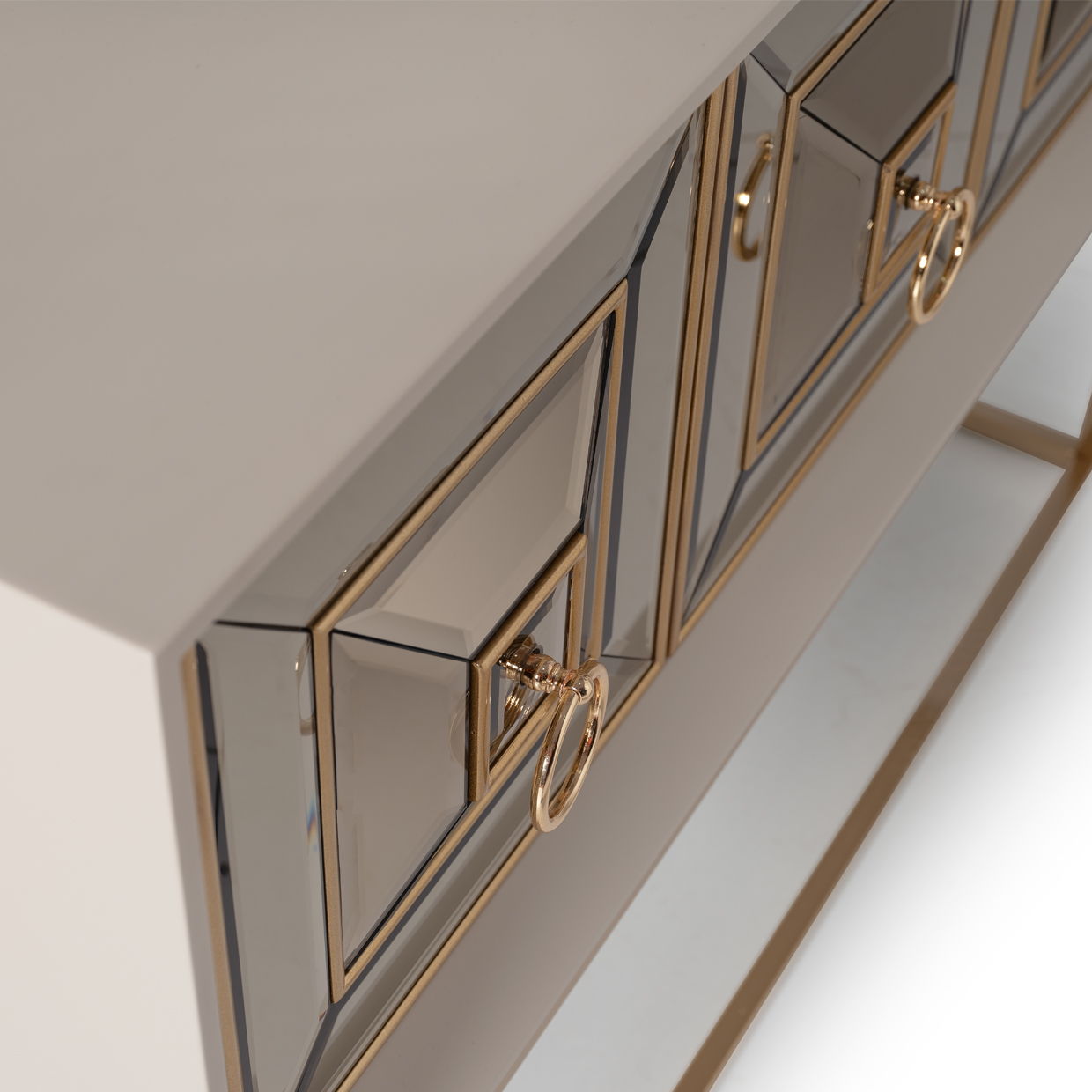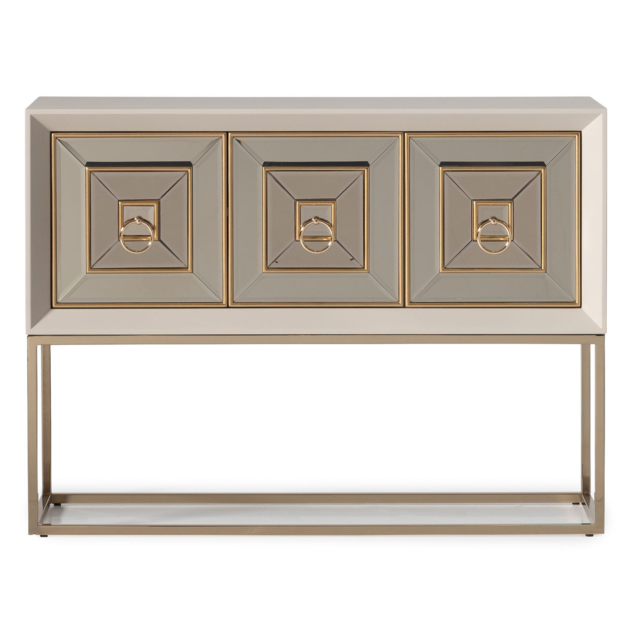 This console is a trio of doors, graced with bronzed mirrored accents, casting tantalizing reflections that add captivating dimensions to your room, transforming ordinary spaces into intimate mysteries of glamour.