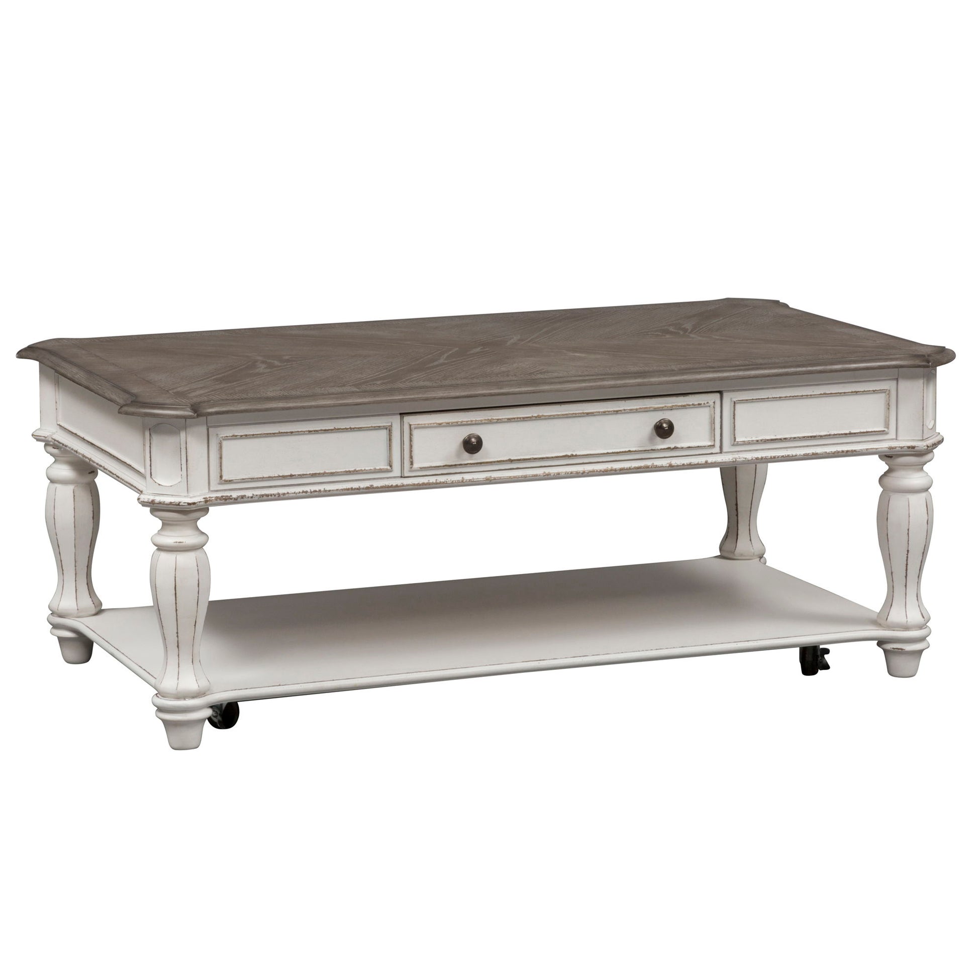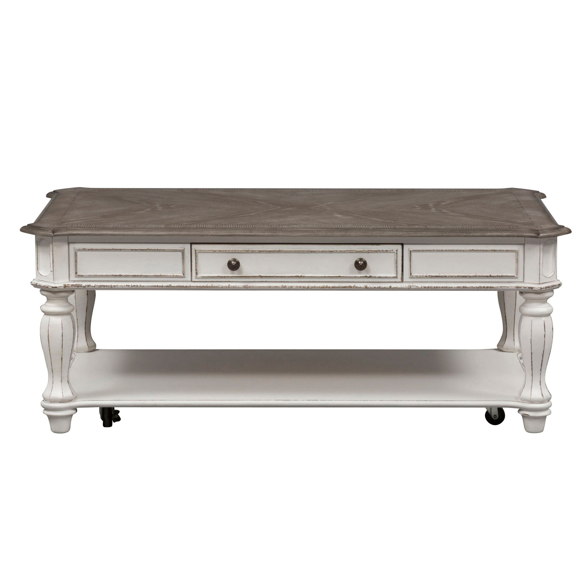 Accent your space with the perfect blend of European design with the Magnolia Manor rectangular cocktail table. Crafted of poplar solids with white oak and birch veneers, this piece features a weathered brown top with whitewash, one fully stained interior drawer with full extension drawer glides making access to storage a breeze, fancy face top, wood framed drawer fronts, bead molding, canted corners, faceted turned legs, casters that make rearranging effortless, and is accented by antique pewter knob hardware. Users can enjoy the added storage for items from magazines, to cozy throw blankets with the bottom shelf. Warm antique finishes and artistic distressing along with grand scale create a piece to be passed to generations.