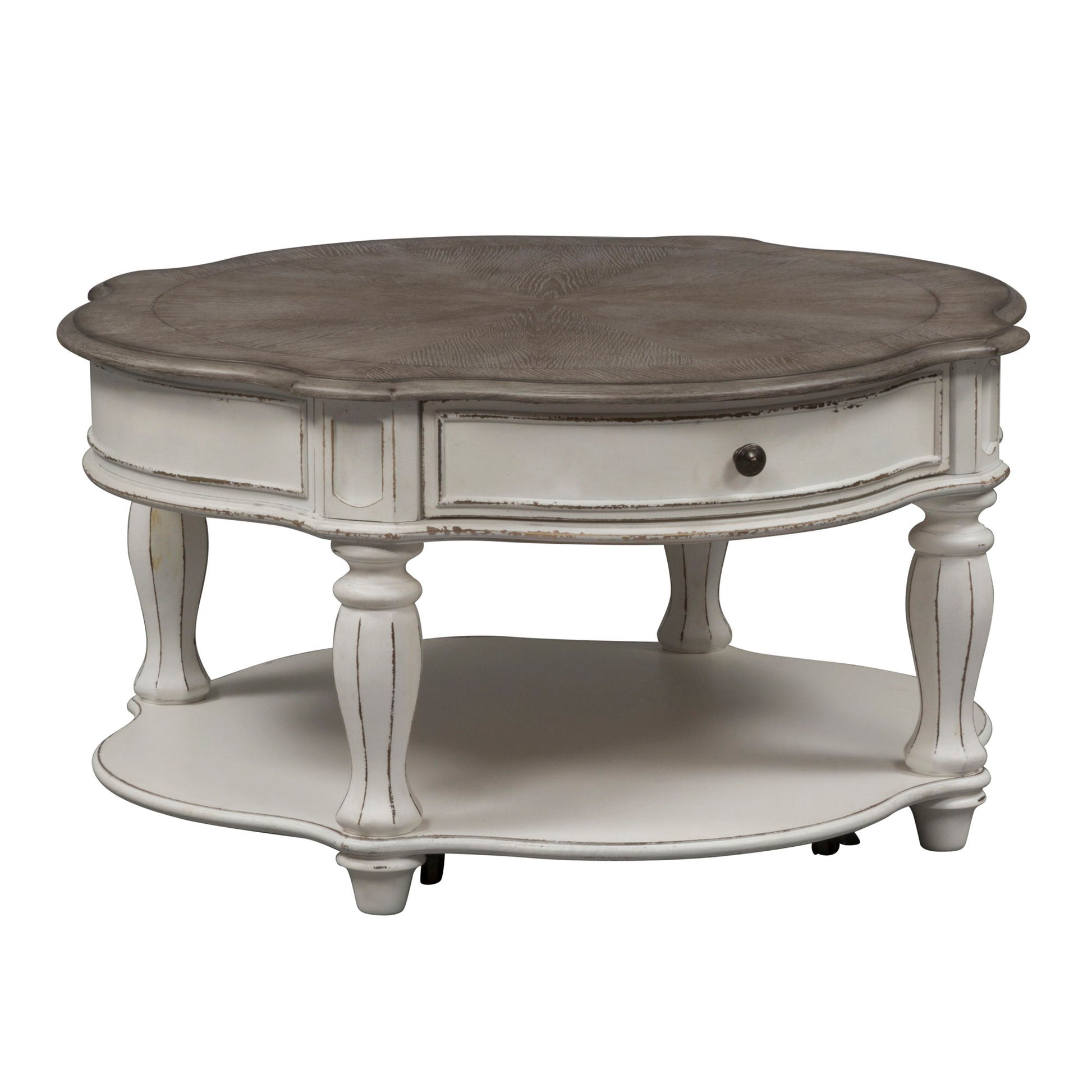 The perfect blend of European design with the Magnolia Manor. Crafted of poplar solids with oak and birch veneers, this piece features a weathered top, one fully stained interior drawer full extension drawer in each table, fancy face top, wood framed drawer fronts, bead molding, canted corners, faceted turned legs, cocktail offers casters that make rearranging effortless, antique pewter knob hardware and a bottom shelf for additional storage. Warm finishes and artistic distressing along with grand scale create a piece to be passed to generations. Kit consists of one cocktail table and two end tables.