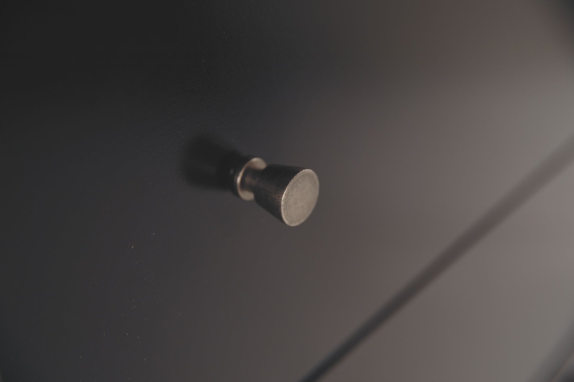 Solid black finish. Casual cottage design accented with pewter color knobs for a more urban look. Scalloped top and base mouldings add dimensional flare to case perimeters. Side roller glides for smooth operating drawers. Twin (53), full (87), queen (57), king (58) headboards can attach to a bolt-on metal bed frame B100-21, B100-31, or B100-66 respectively. Queen (57) panel headboard is capable of attaching a full sized metal bolt on bed frame. Safety is a top priority, clothing storage units are designed to meet the most current standard for stability, ASTM F 2057 (ASTM International). Drawers extend out to accommodate maximum access to drawer interior while maintaining safety.