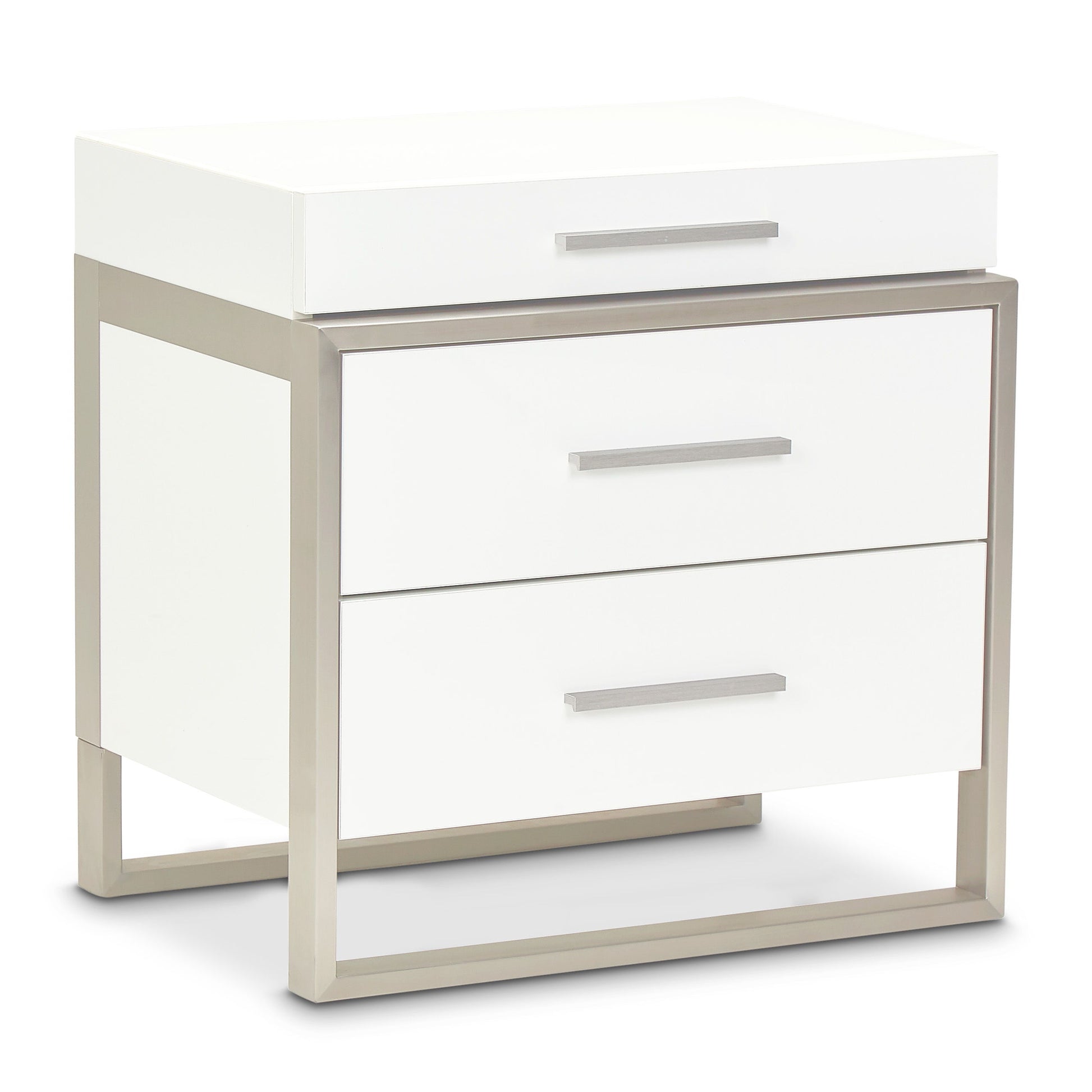 Choose unique. The Marquee Nightstand is all about the balance between uniform and asymmetry. With an offset brushed stainless steel frame and tiered top drawer, you get the striking modern look with a refreshing twist.