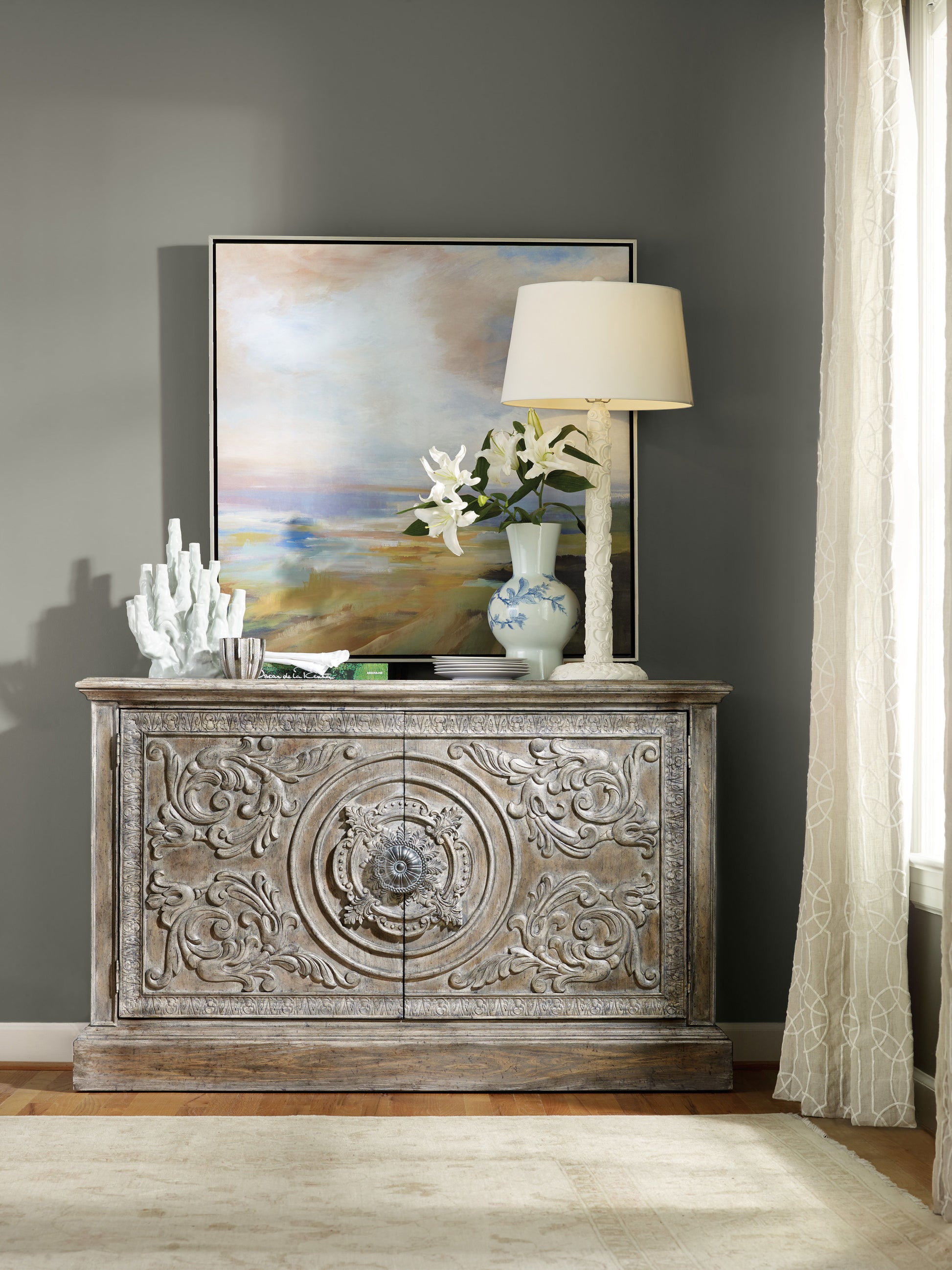Featuring an intricately carved floral patterned front and an opulent, oversized center pull in an aged silver tone, the Mélange 2-door Accent Console is a stunning focal point in a soft driftwood-tone finish with whitewash paint. One adjustable wood shelf behind the pair of doors and a ventilated back panel. Come closer to Melange, and you will discover something unexpected, an eclectic blending of colors, textures and materials in a vibrant collection of one-of-a-kind artistic pieces.