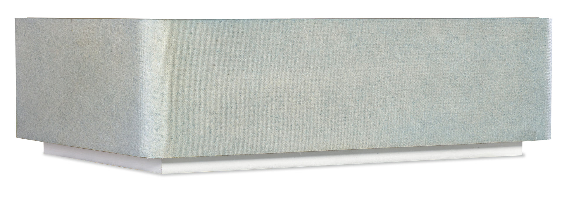Serene and stylish with a spa-like color scheme, the modern Atlantis Cocktail Table has a large rectangle shape, rounded corners, a painted tempered glass top, raffia-wrapped exterior and white plinth base. The top is painted in a creamy white tone, and the raffia wrap is in a pale blue tone inspired by Caribbean beaches.
