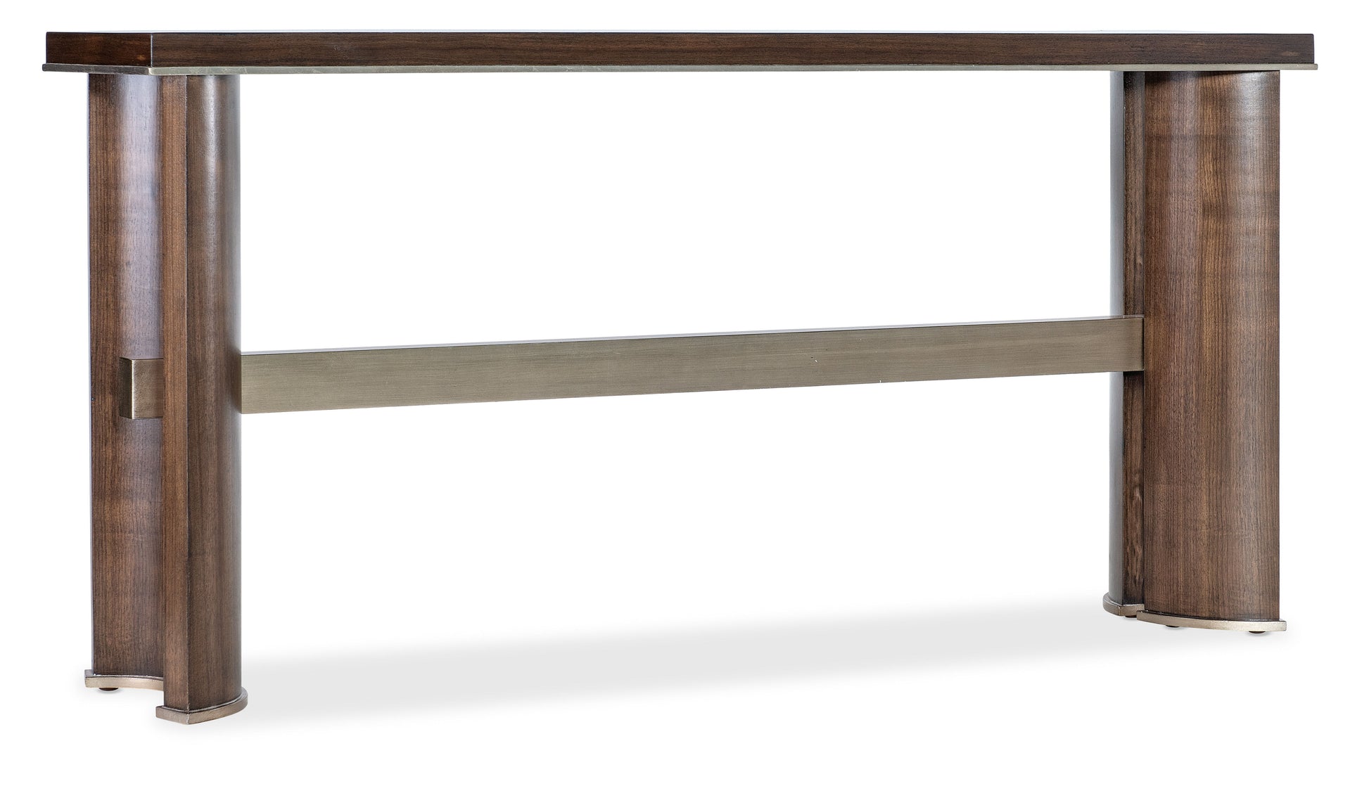 Classy and timeless, the Contours Console combines Walnut Veneer construction in a matched veneer pattern on top with a champagne-finished stretcher and accent trim. Featuring a narrow rectangle shape and concave-shaped legs, it has a narrow rectangle shape measuring 68 inches wide x 15 inches deep.