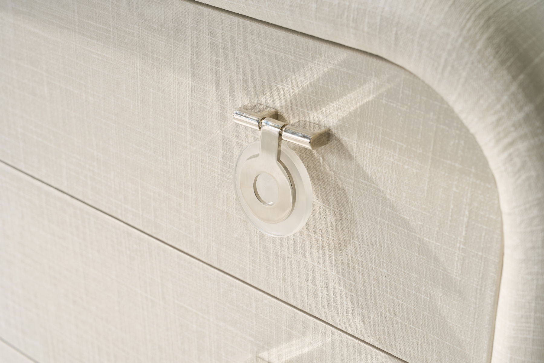 With an understated modern elegance, the Julip Accent Chest is designed with a clean silhouette, clear acrylic legs and metal accents. With a linen-wrapped exterior and drawer fronts and rounded corners, it has chrome-hued, jewelry-like metal drop pulls and three self-closing drawers.