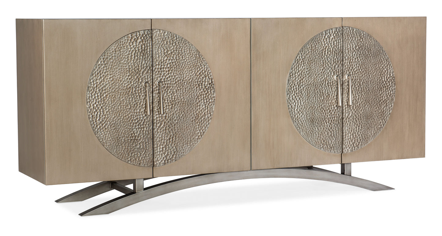 Serene and shimmering in a palette of silver and champagne, the Nolita Four-Door Entertainment Console is a class act for any space. Crafted of Maple Veneers, resin and metal, the console has a champagne finish with side-by-side medallion-like inserts and metal teardrop pulls in a pewter finish, along with a pewter base. The four doors have soft-close hinges, and there’s one adjustable shelf behind each pair of doors, along with a ventilated back panel and FC705 three-plug electrical outlet. Accommodates up to a 75-inch TV.