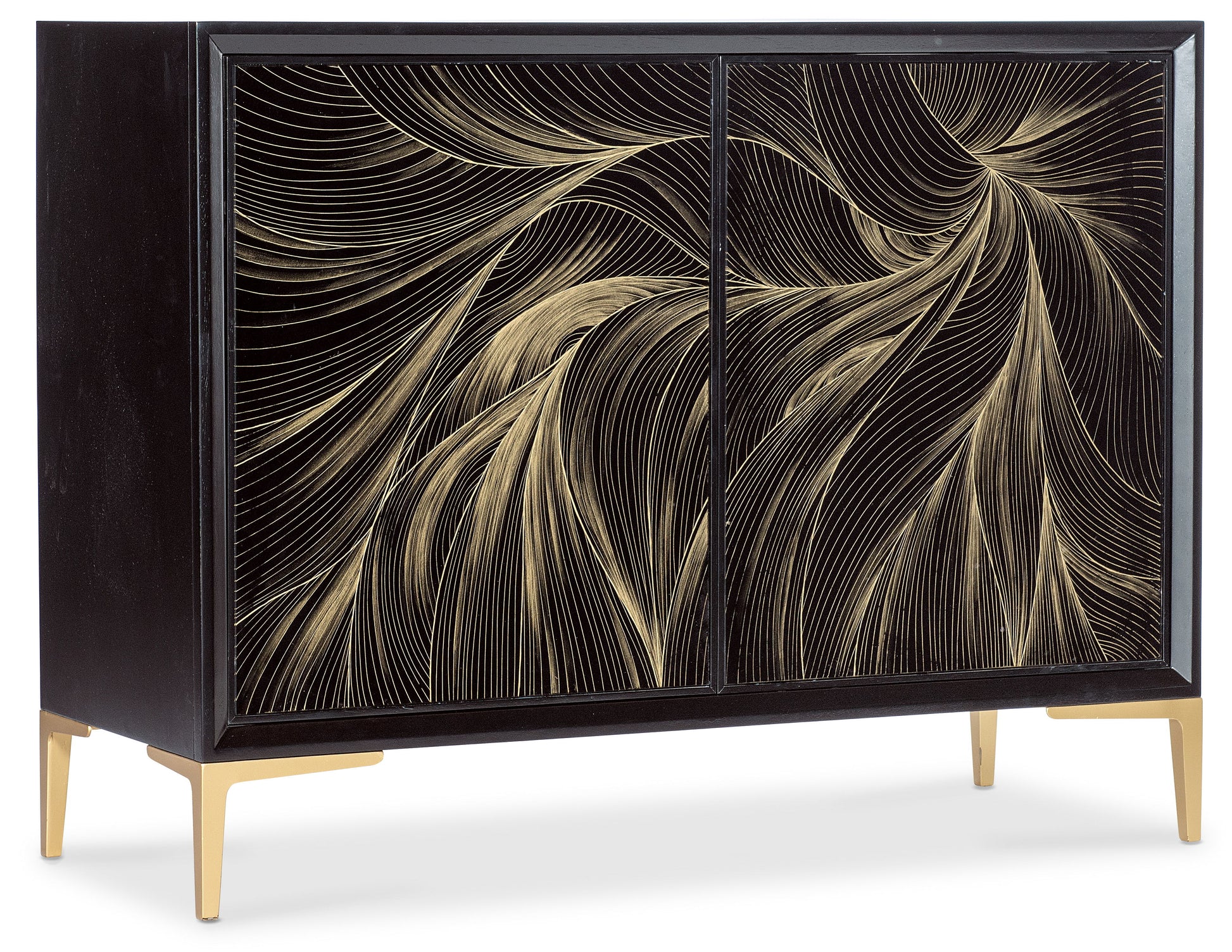 The gold abstract willow motif on the glass-painted door fronts contrasts with the black finished exterior, giving a tropical yet sleek feel to the Willow Hall Chest. Crafted of Maple Veneer, the chest has slender gold metal legs. Behind the two touch-latch doors with soft-close hinges is one adjustable shelf.