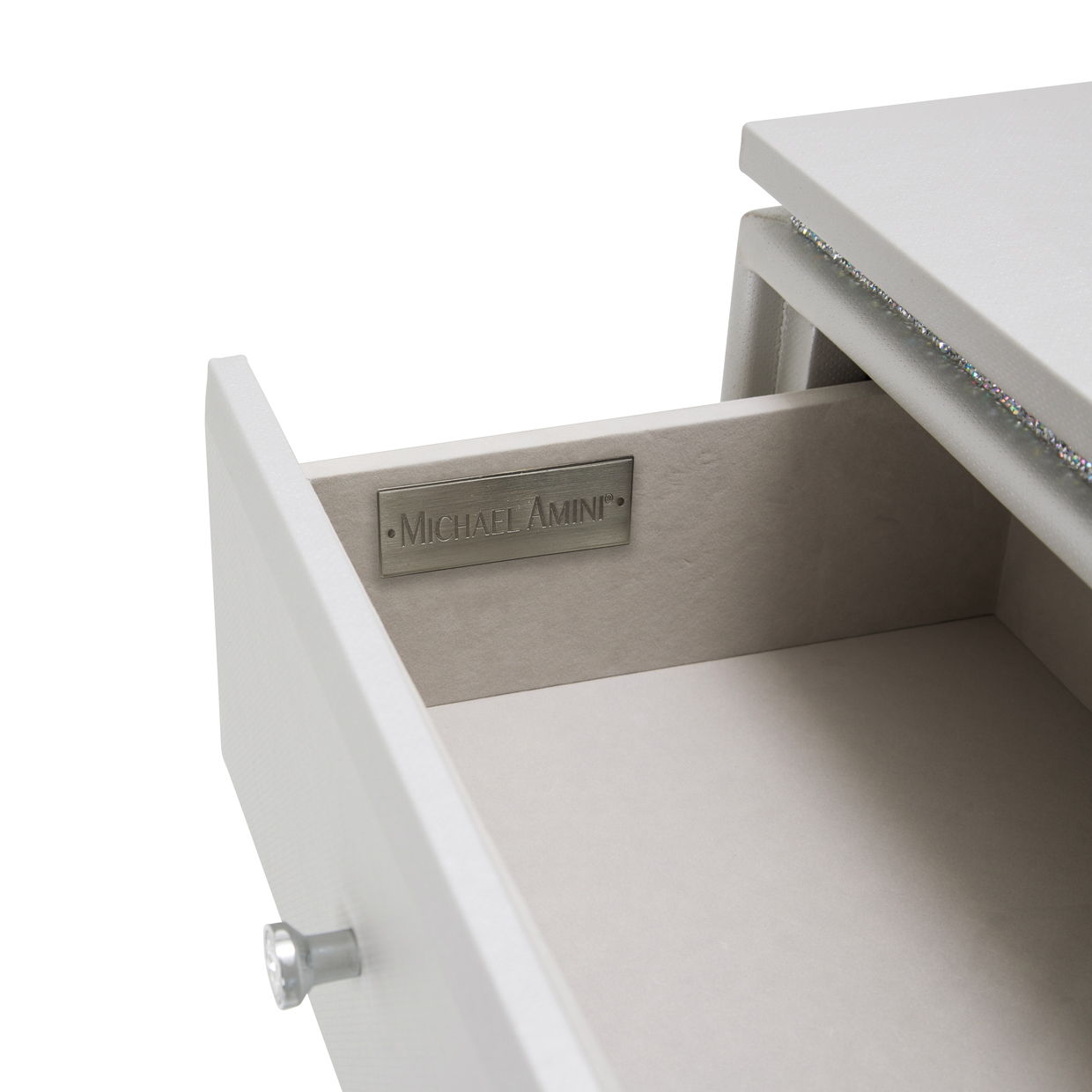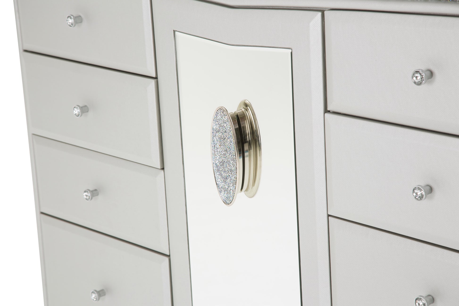 Ready to feel like royalty? The Melrose Plaza Dresser is ready to help. With a diamond-bright glow, crystal accents and mirrors, you won't mind folding laundry one bit. Each item deserves a place, which is why this dresser features eight velvet lined drawers and a long center cabinet with shelving and a built-in jewelry drawer.