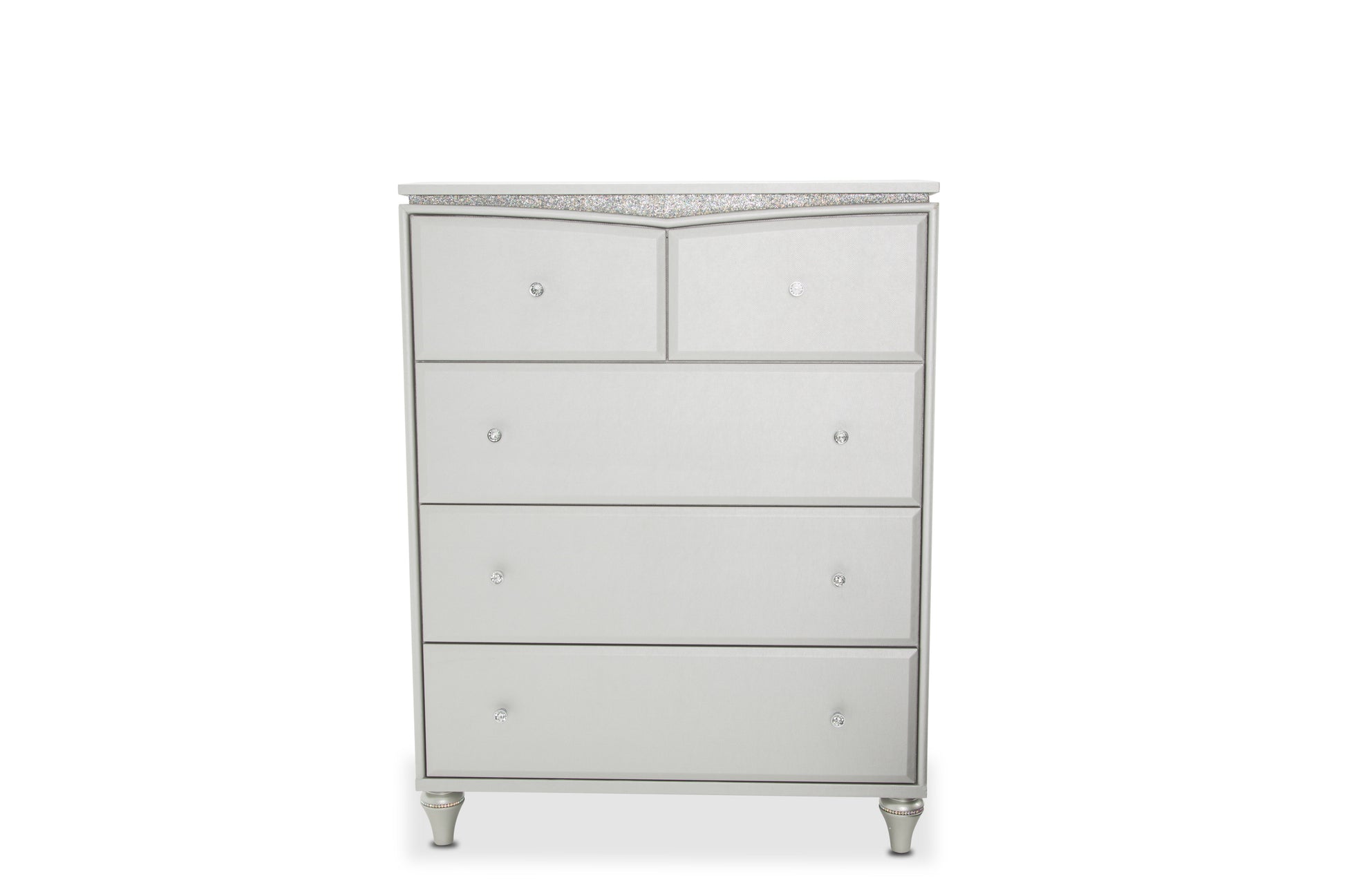 Glamorous, subtle, and stunning. This Melrose Plaza Chest will bring a diamond glow to your room while blending into your style seamlessly. Fold your clothes into five velvet lined, deep-storage drawers, and enjoy the elegant crystal trim and Glam silhouette. Accent this chest with your favorite decor to make it yours, and watch your room light up instantly!