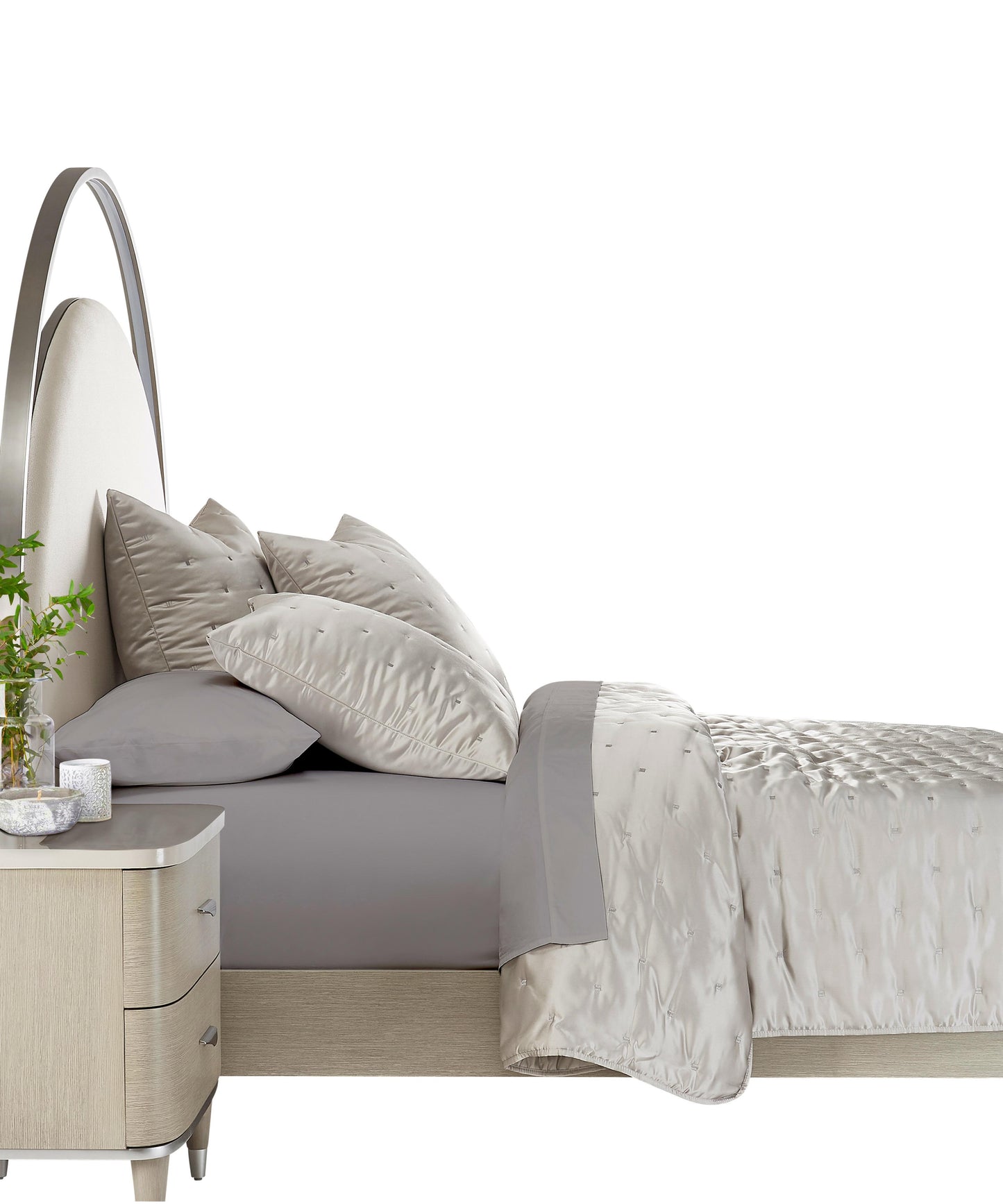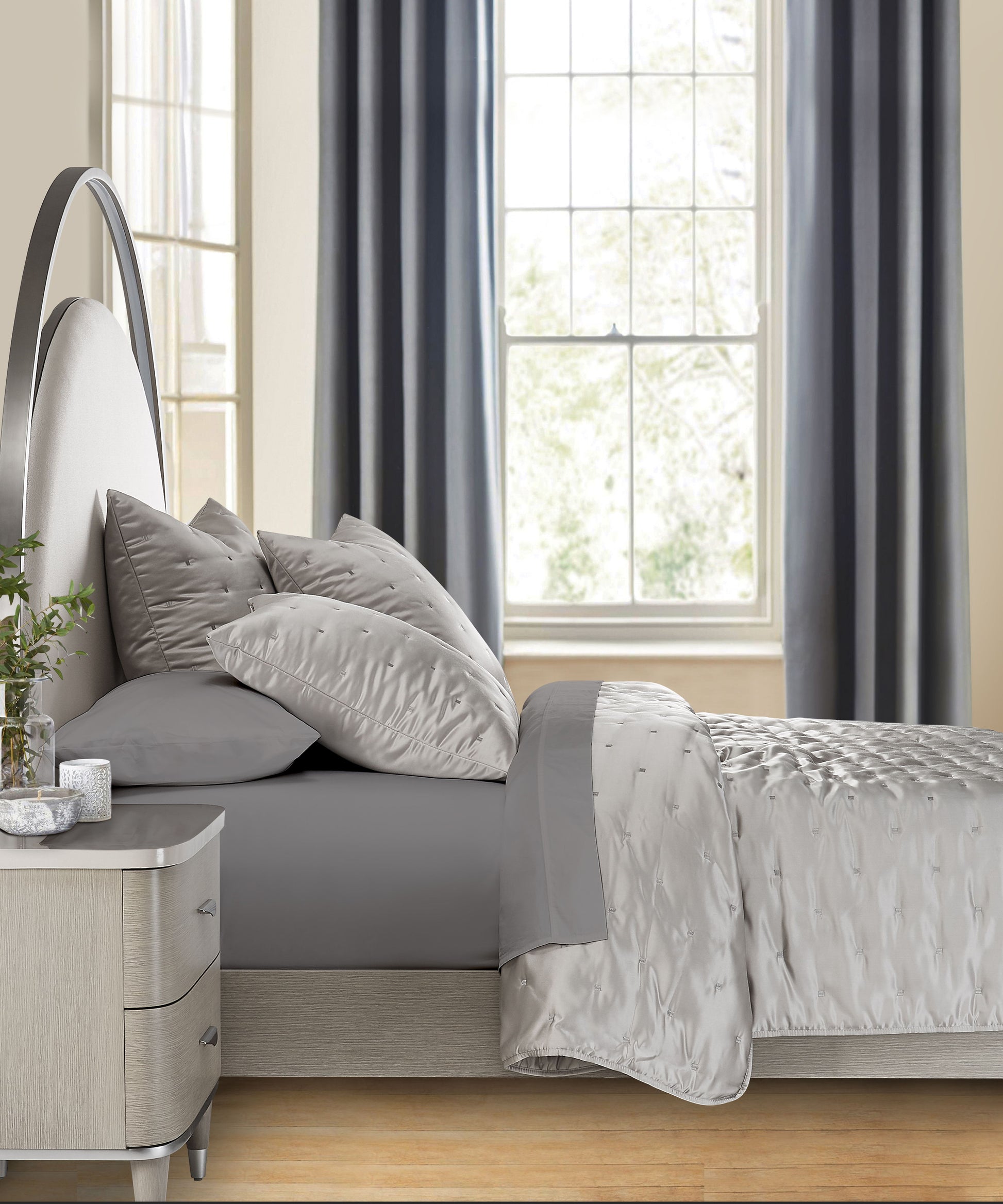 The Messina quilt set is the perfect complement to any stylish bedroom. Featuring a polished platinum color and square embroidery for dynamic texture, this set looks lovely on its own or paired with another set! Quilt and Euro shams are reversible.