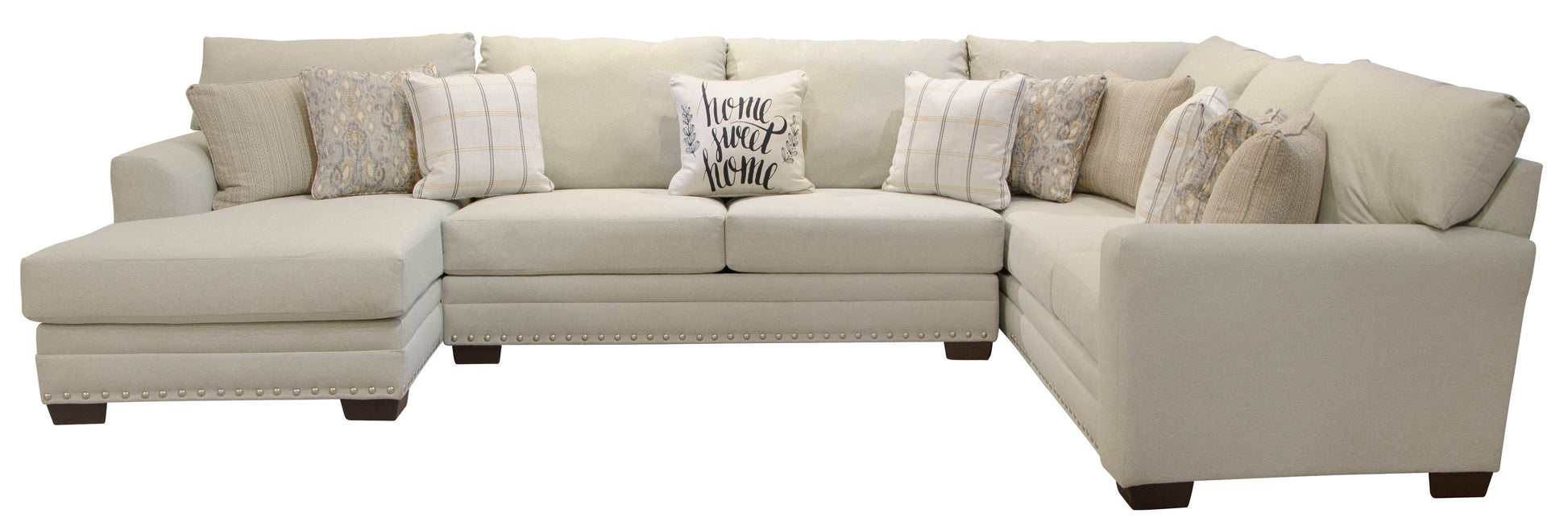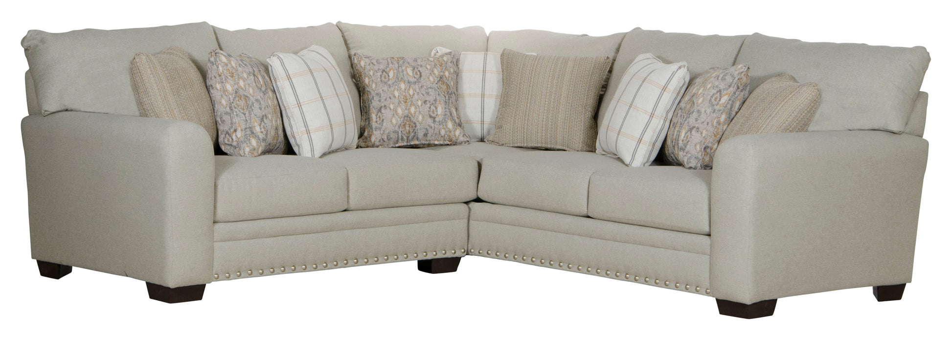 The contemporary farmhouse styling of the Middleton sectional brings comfort and style to any room. The seats are constructed of individually pocketed coils encased in foam and topped with a layer of cool gel infused memory foam for a long lasting, comfortable and supportive seat. Covered in a soft, durable 100% polyester fabric in a light gray color the Middleton is durable enough for use in a family room, basement or bonus room. The exceptional styling shows through with the included decorator accent pillows and nickel nail head accents along the base rail.