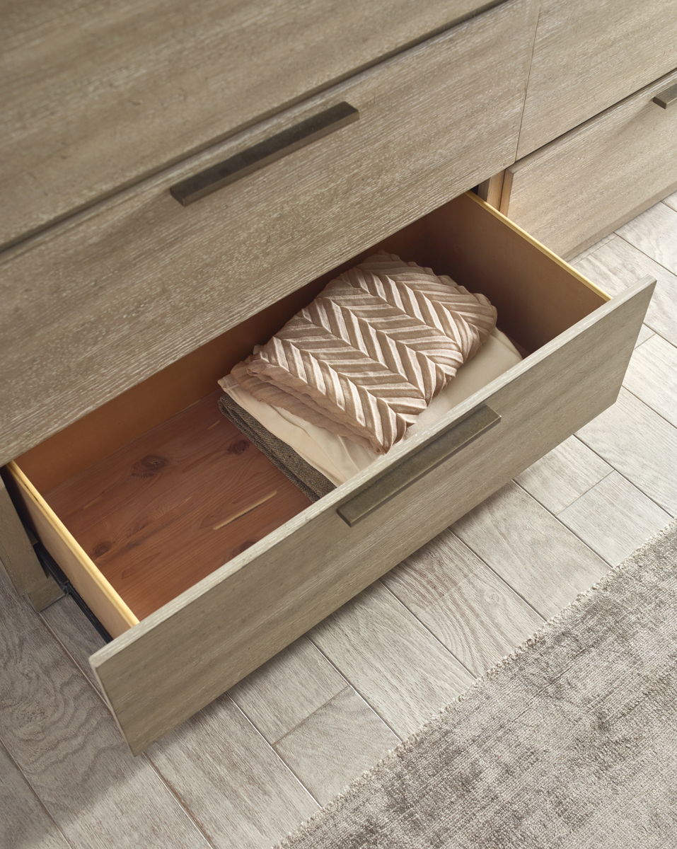 Milano by Rachael Ray is inspired by the Italian capital of fashion and design. With clean lines and modern styling, the Dresser is a beautiful addition to this collection. A rich textural finish combines with custom modern bronze hardware, creating an air of sophistication. There is no shortage of storage with six deep drawers. The top right drawer includes a jewelry tray. Cedar lined bottom drawers protect clothing. A Sandstone finish reflects the architecture of the collection’s classic namesake. Pair with the 9660-0100 Mirror for a polished look. Or combine with the 9660-1230 TV Frame and stretch out as you watch your favorite shows. Explore the rest of the collection for a bedroom that pops in style. Rachael’s Milano brings a little taste of Italy to any home.