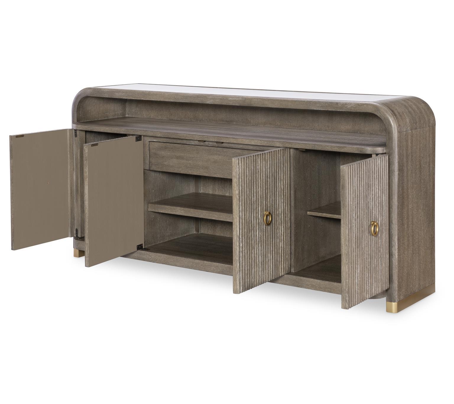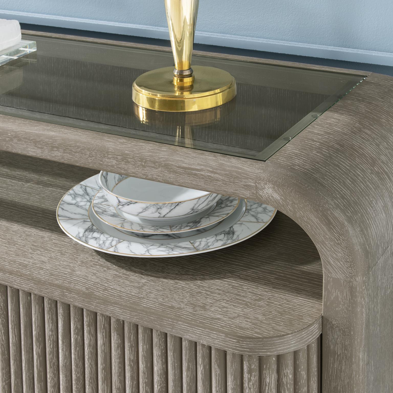 Approachable glamour. That's the look of the Miramar Total Home Collection from Legacy Classic - Modern. The collection features and acrylic accents bold fluting detail and waterfall edges. The accent finish is used in banding on case bases and foot rails table bases and on the posters of the Canopy Bed and low-post bed.