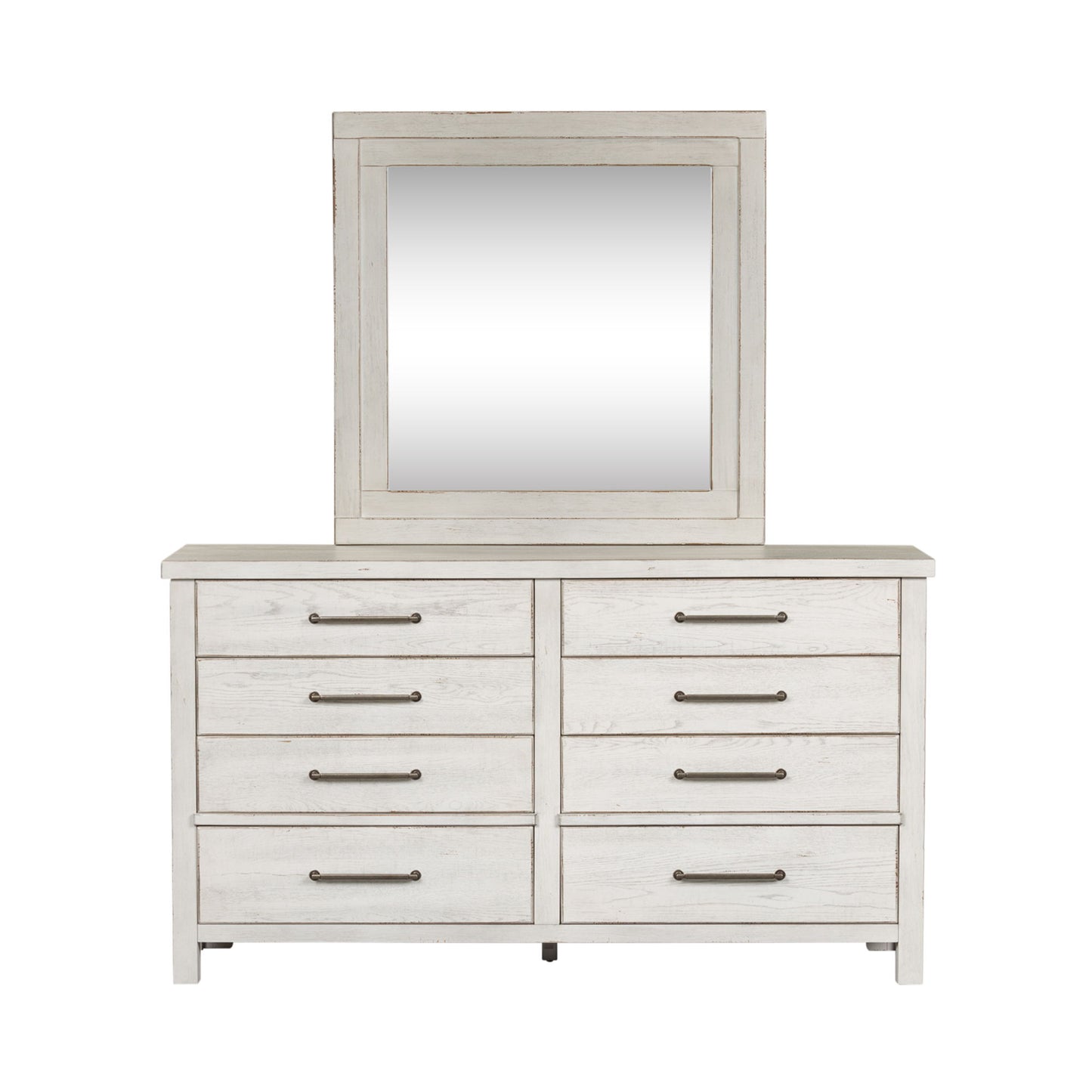 Inviting and inspirational describes the Modern Farmhouse dresser and mirror. Crafted of poplar solids with knotty oak veneers this kit features a dusty finish with heavy distressing, block style pilasters, flat front drawers, full extension drawers with premium felt lined top and cedar lined bottom drawers, accented with washed brass elongated bar pull hardware. The dresser has eight drawers and pairs well with the wood framed mirror with a beveled edge that can be attached with the included bolt-on supports. Inviting and Inspirational the Farmhouse look is a design style that works with cottage or contemporary. It is more about creating a look that we love.
