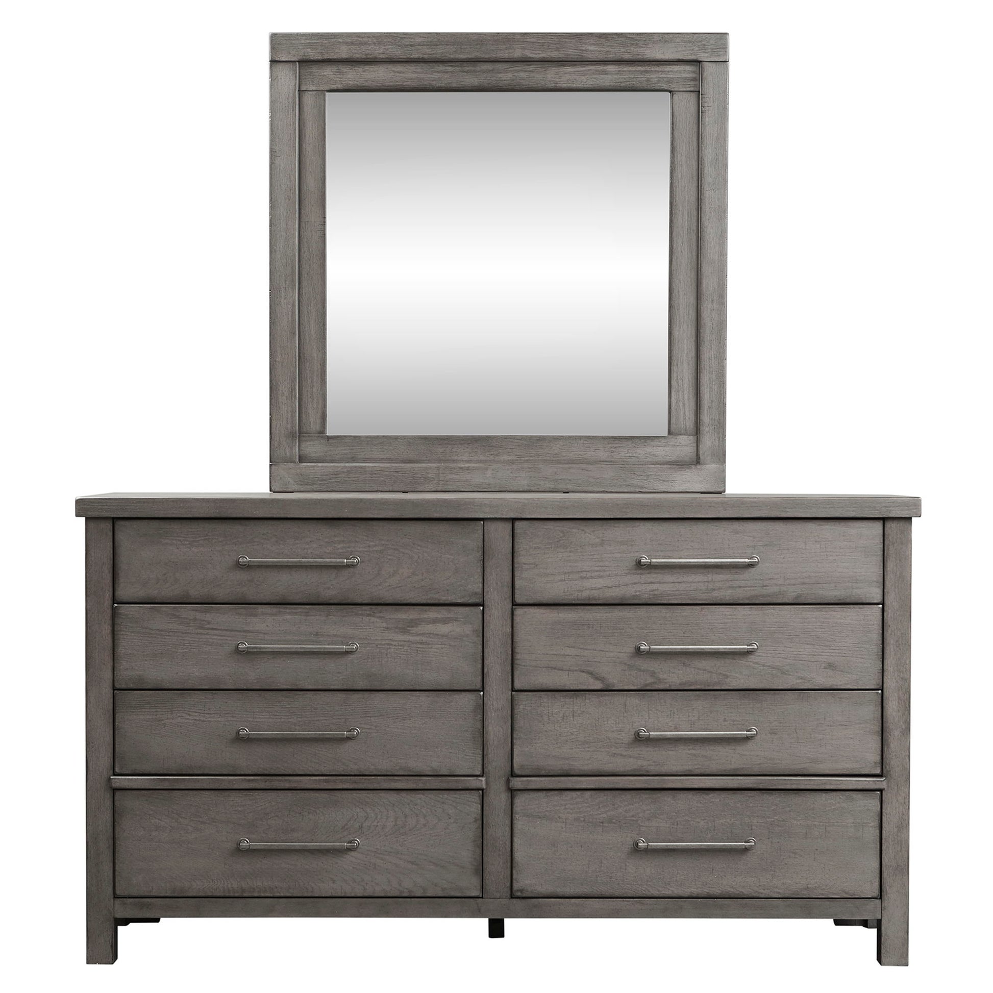 Inviting and inspirational describes the Modern Farmhouse platform bed, dresser, and mirror. Crafted of poplar solids with knotty white oak veneers this kit features a dusty charcoal finish with heavy distressing, block style pilasters, flat front drawers, full extension drawers with premium felt lined top and cedar lined bottom drawers, accented with washed brass elongated bar pull hardware. The platform bed features a geometric high-low veneer pattern on the headboard, and a low-profile platform footboard. This bed does not require a box spring allowing you the full experience of a true platform bed. The dresser has eight drawers and pairs well with the wood framed mirror with a beveled edge that can be attached with the included bolt-on supports. Inviting and Inspirational the Farmhouse look is a design style that works with cottage or contemporary. It is more about creating a look that we love.
