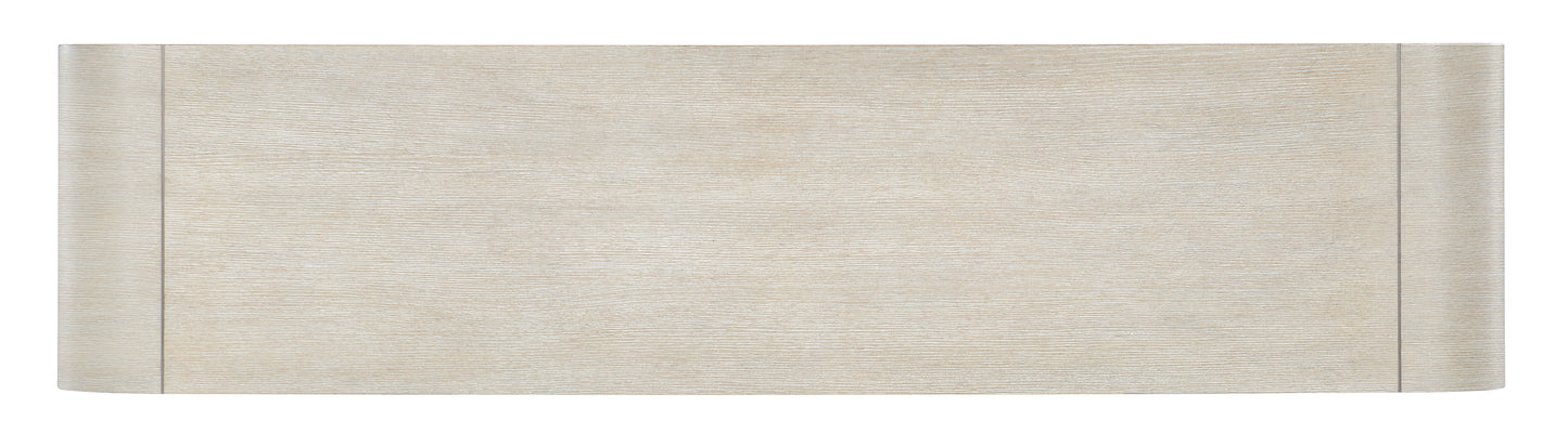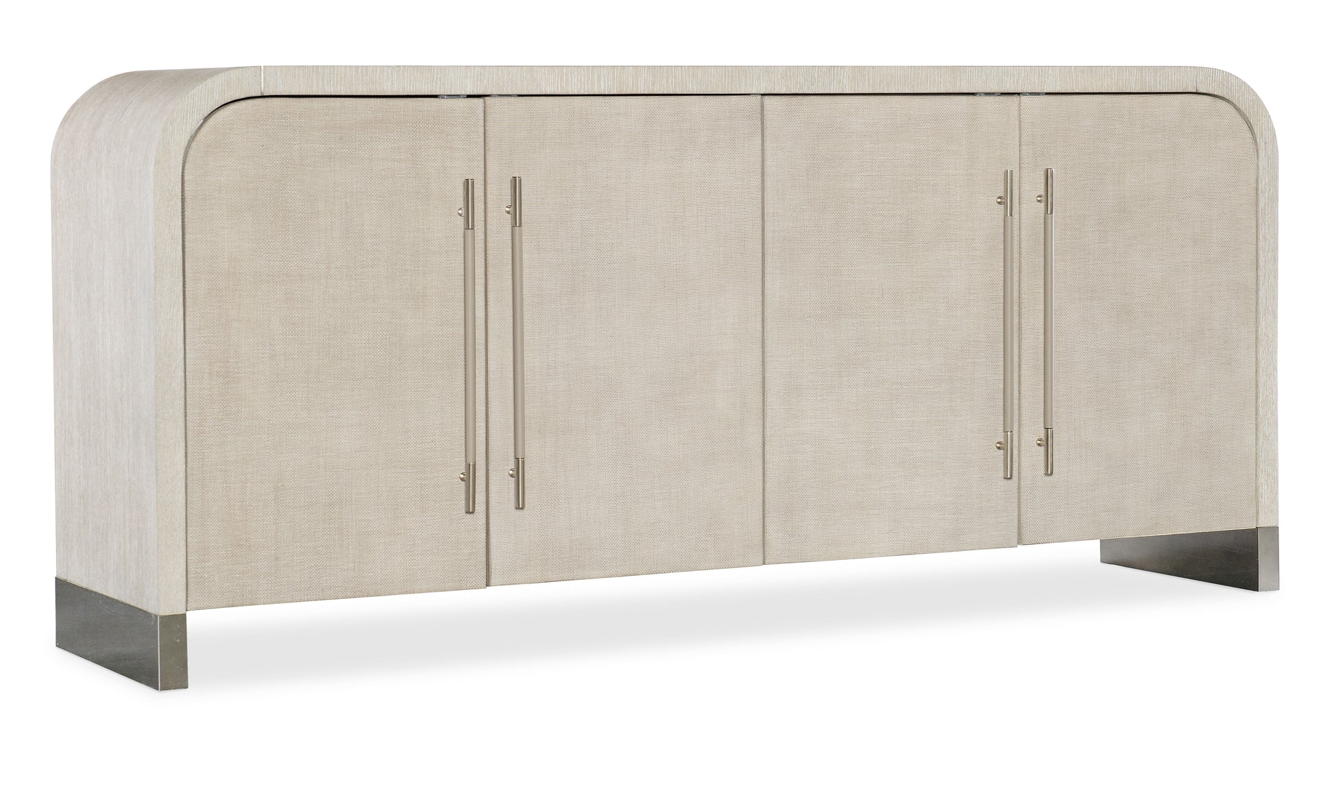 Sleek and stunning with a timeless sophistication and soft modern aesthetic, the Modern Mood Buffet combines Quartered Oak Veneers with raffia-wrapped doors, warm pewter brushed metal bar pulls accents. The Diamond Finish has crystal-like alabaster and pewter hues, offering a serene style. Features include 4 doors with soft-close hinges and magnetic catches, two adjustable wood shelves behind each pair of doors, ventilated back panels and wire management holes in the back panel and a 3-plug electrical outlet behind the right-side doors.
