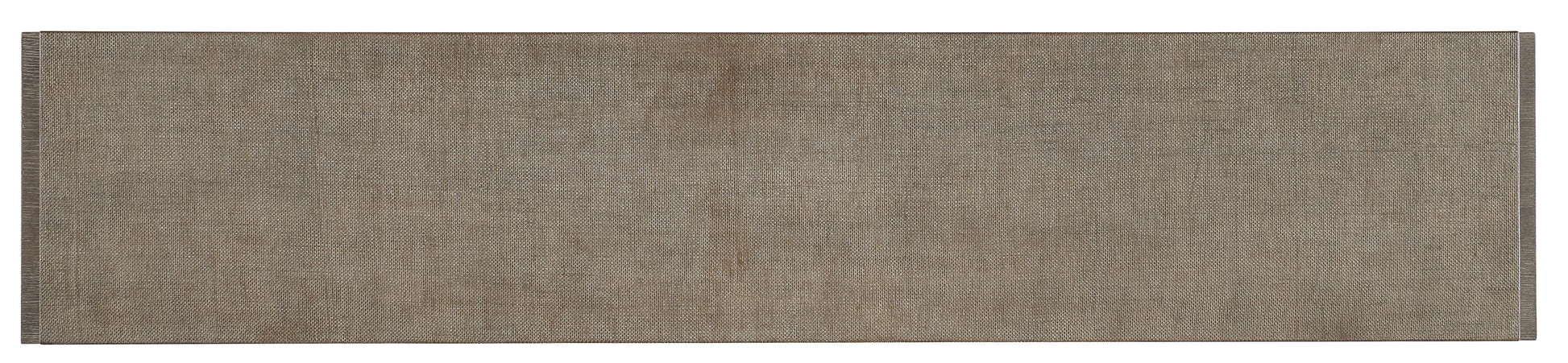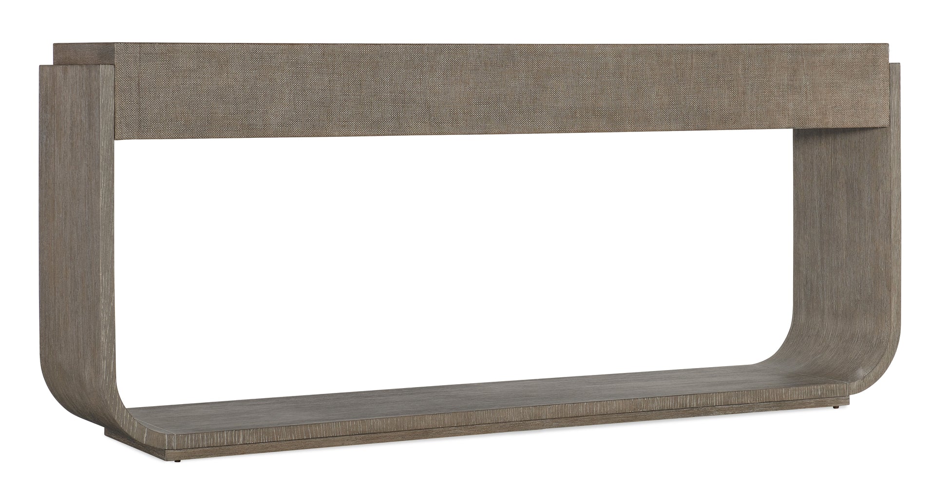 Symmetrical and timeless with a luxe mixture of materials, the soft and sophisticated Modern Mood Console Table has a narrow rectangle shape with rounded sides and a raffia-wrapped drawer front and top. Crafted of Quartered Oak Veneers with wire-brush detailing, it is finished in the serene Diamond finish, accented by round knobs in a warm pewter finish wrapped in leather.