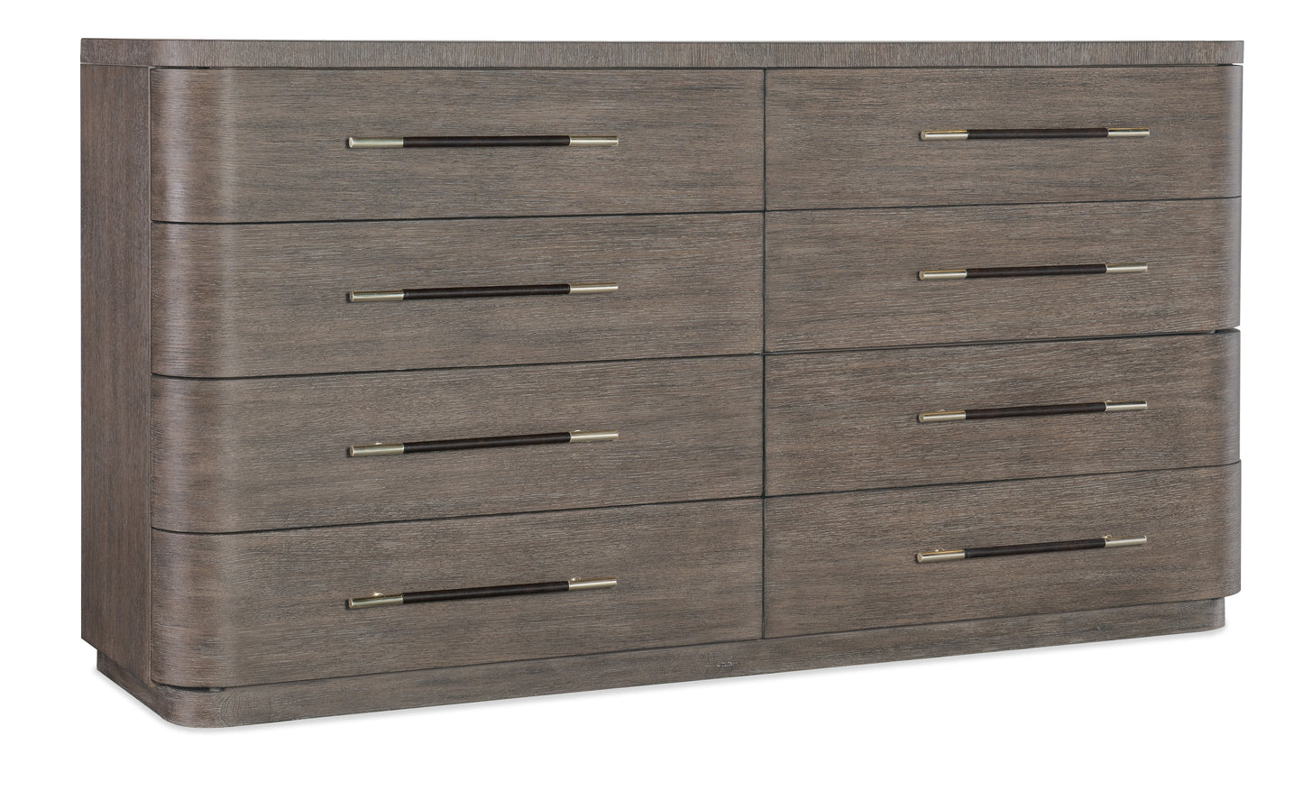 Softly sophisticated with a clean modern profile and luxe mixture of materials, the Modern Mood Dresser is a stunning statement piece. The case has rounded corners and a plinth base and offers 8 self-closing drawers. The top two drawers have drop-in felt liners, there’s a removable jewelry tray in the top right drawer and the bottom two drawers are cedar-lined. Crafted of Oak Veneers, the dresser is finished in the serene Diamond color and accented by metal pulls wrapped in leather.