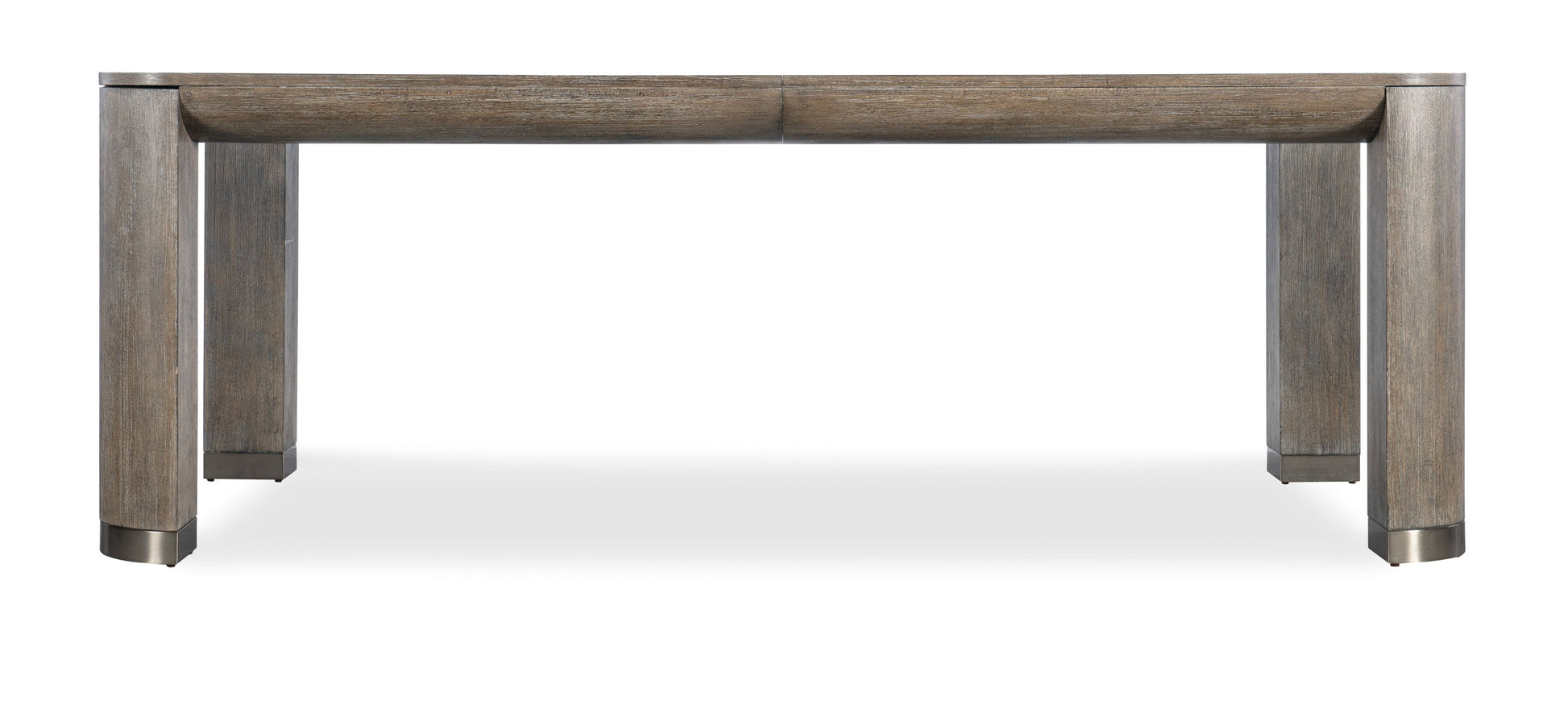 Inspired by decades of design movements with an unmistakably modern aesthetic that transcends time, the Modern Mood Leg Dining Table is a striking, softly sophisticated profile. Featuring a rounded table apron and corners, matched veneers on the top and metal banding accents on the legs in a warm pewter finish, it is crafted of Quartered Oak Veneers in a Diamond Finish with crystal-like alabaster hues. With one 24-inch leaf, the table extends up to 110 inches long.