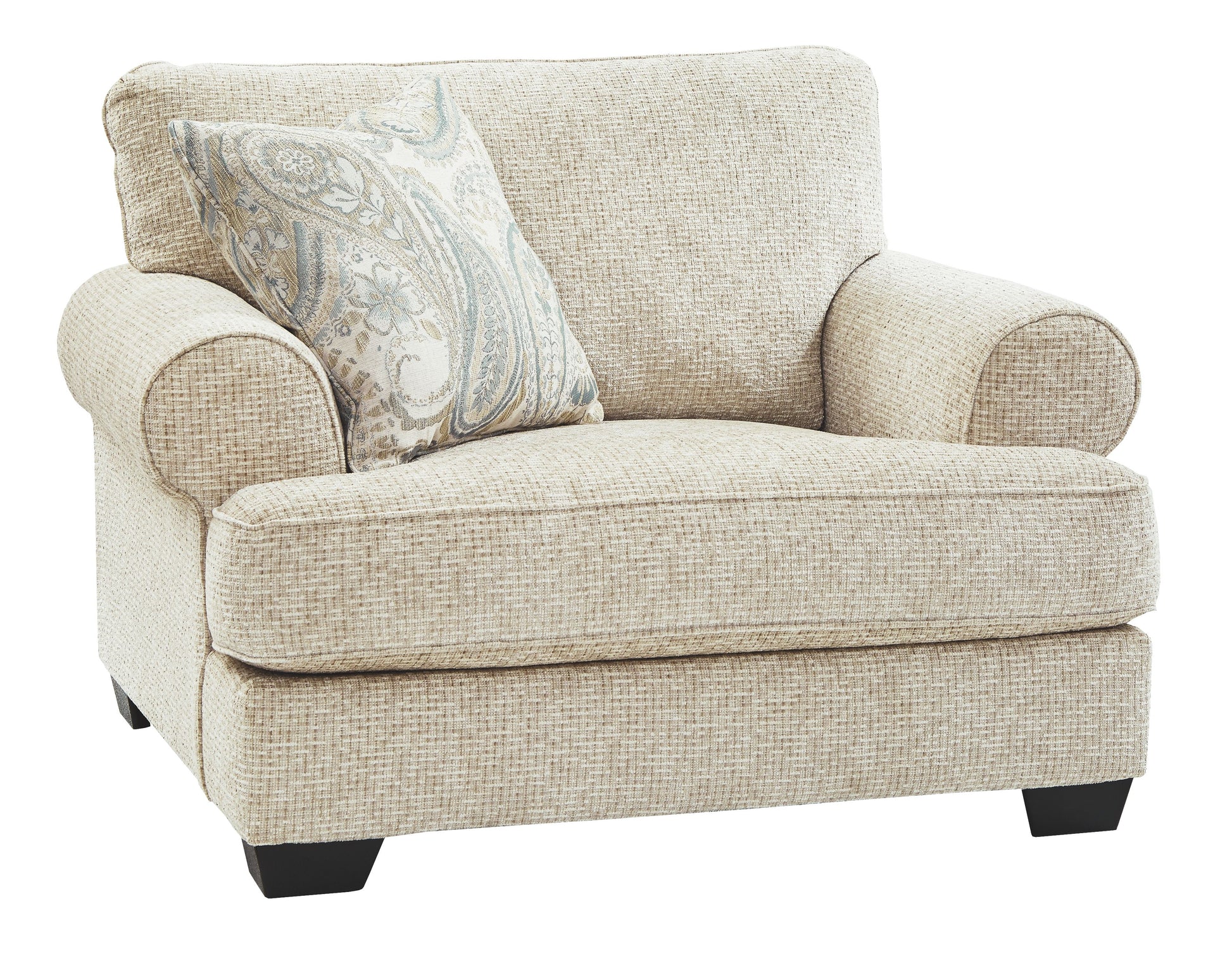 This oversized chair strikes a beautiful balance between classic and current. Its traditional elements include t-cushion seating and setback roll arms, angled for modern flair. A jacquard paisley pillow makes a muted, mellow complement to the chair’s casual textured chenille upholstery. And the choice of sandstone beige is a light and lovely style awakening.