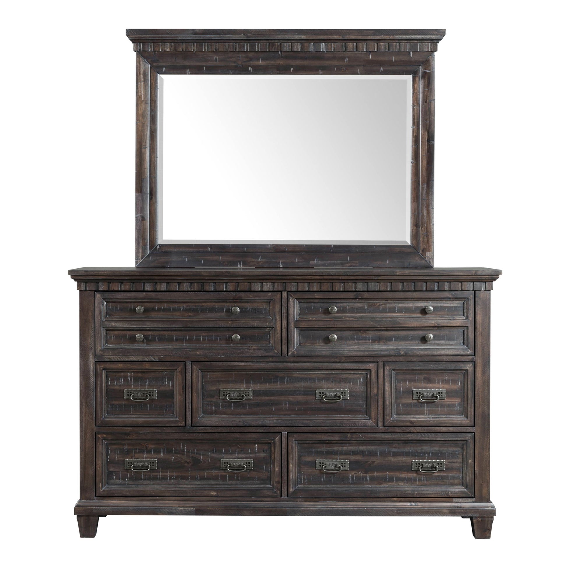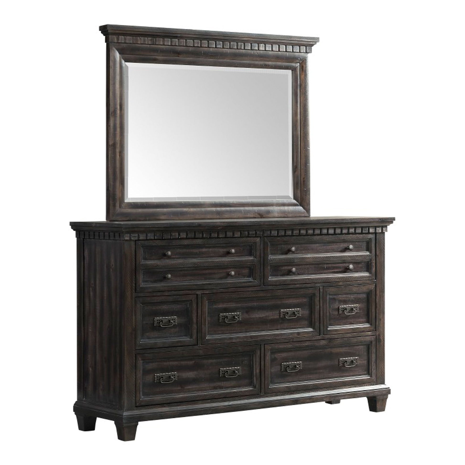 The Morrison 7-Drawer Dresser with Mirror Set features two hidden drawers to keep your most precious valuables safe! Elegant oil rubbed bronze finished knobs and pulls pair nicely with the beautiful smokey walnut finished wood. This horizontal dresser comes with seven, spacious drawers; perfect for keeping all of your belongings neatly in one place. Dust proofing on the bottom drawers help protect your belongings. The portrait mirror pairs perfectly with the dresser. Dental molding and bevel edges complete the look of this transitional design.