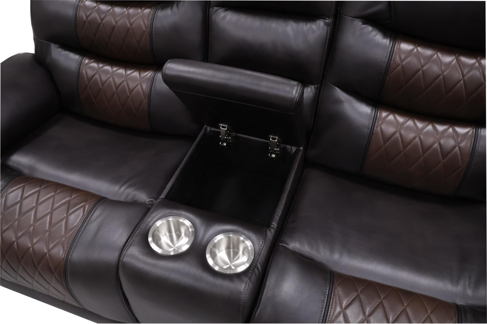 Experience the perfect blend of comfort and functionality with the Nikko Dual Recliner Storage Console Loveseat with Hidden Cupholders . This loveseat, constructed with hardwood and plywood frames, ensures long-lasting durability and stability. The combination of resilient foam cushions and pocket coil support offers a luxurious, cozy place to lounge. The two-tone fabric, made from 80% polyester and 20% PU, provides the soft touch and look of leather while remaining breathable. Featuring distinctive details like nailhead trim, diamond stitch pattern seats, double wrapped headrests, and expert tailoring, this loveseat stands out in any home. Practical lifestyle features include extra storage in the center console and hidden pull-out cupholders under the armrests. Enjoy ultimate relaxation with plush pillowed arm and headrests, reclining backs, and comfortable footrests. Indulge in unparalleled comfort and style in your home with the Nikko Reclining Loveseat.