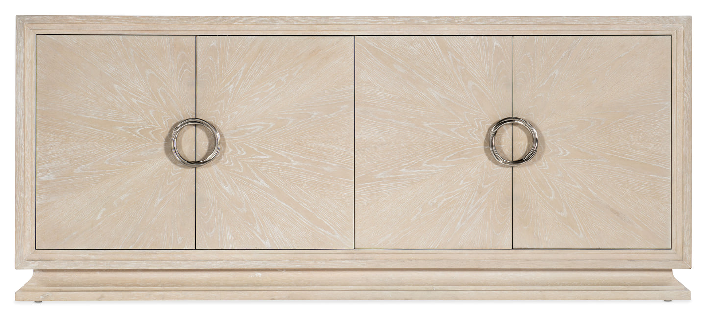 A brilliant fusion of classic architectural elements, movement of soft angles and a serene Sandstone finish on Cathedral and Quartered Oak Veneers, the Nouveau Chic Entertainment Console pairs calm chic style with function. Accommodating up to an 80 inch TV, the console has 4 doors with soft-close hinges and magnetic door catches with two adjustable wood shelves behind each pair of doors. Includes a 3-plug outlet behind the right-side doors and a ventilated back panel.