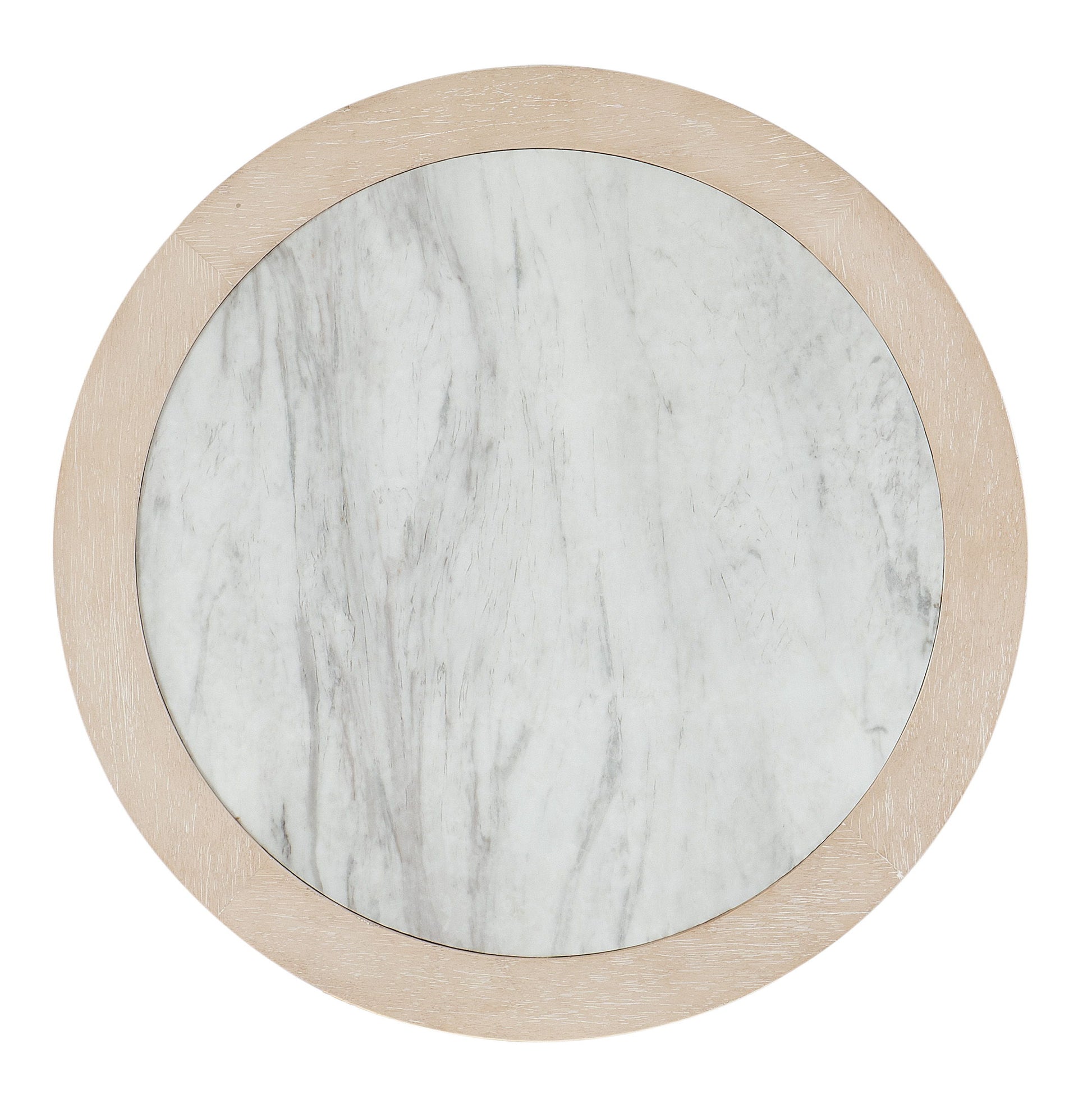 A brilliant blend of materials, the Nouveau Chic Round Nightstand combines Oak Veneers, a White Marble inset top and a metal frame and delicate oblong pulls. With a softly rounded shape, it features three self-closing drawers with cream-colored painted drawer interiors and two USB charging ports with a cord clip on the back.