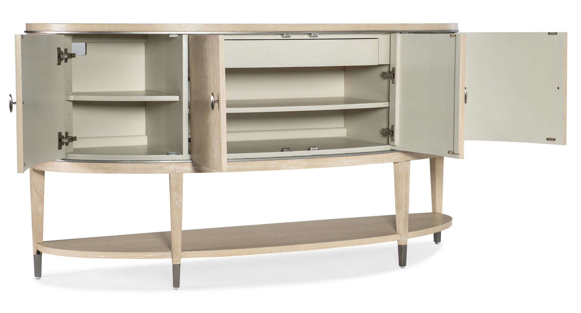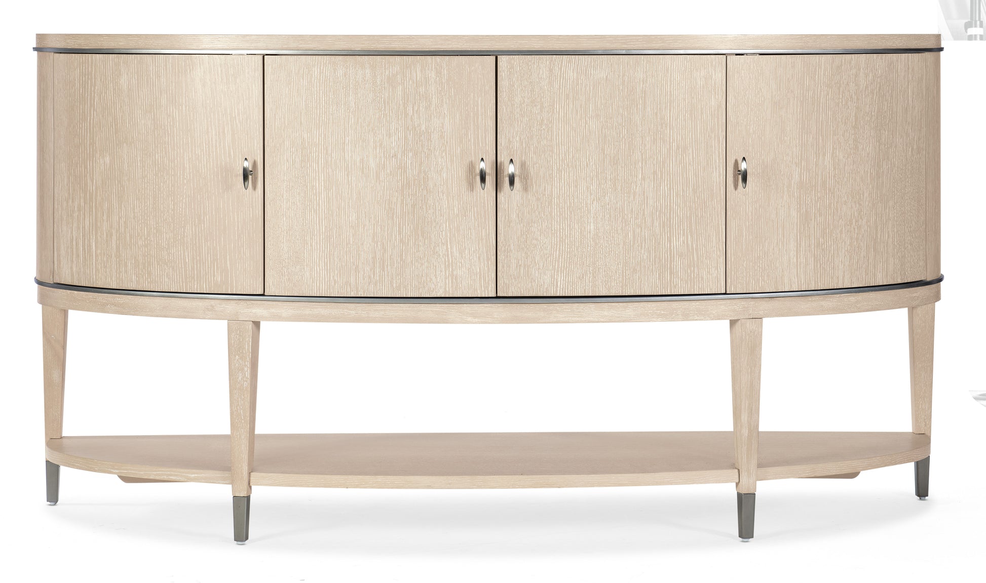 A graceful blend of design, fashion and performance, the Nouveau Chic Sideboard pairs a serene Sandstone finish on Cathedral and Quartered Oak Veneers with the soft shapes of classic architecture. Metal ferrules on the legs and a metal band accent on the case and hardware add a touch of sparkle. Four doors with soft-close hinges and magnetic catches feature one self-closing drawer with removable black felt- lined silver tray behind the center pair of doors. There’s one adjustable wood shelf behind each left and right-side doors and one fixed wood shelf at the bottom.