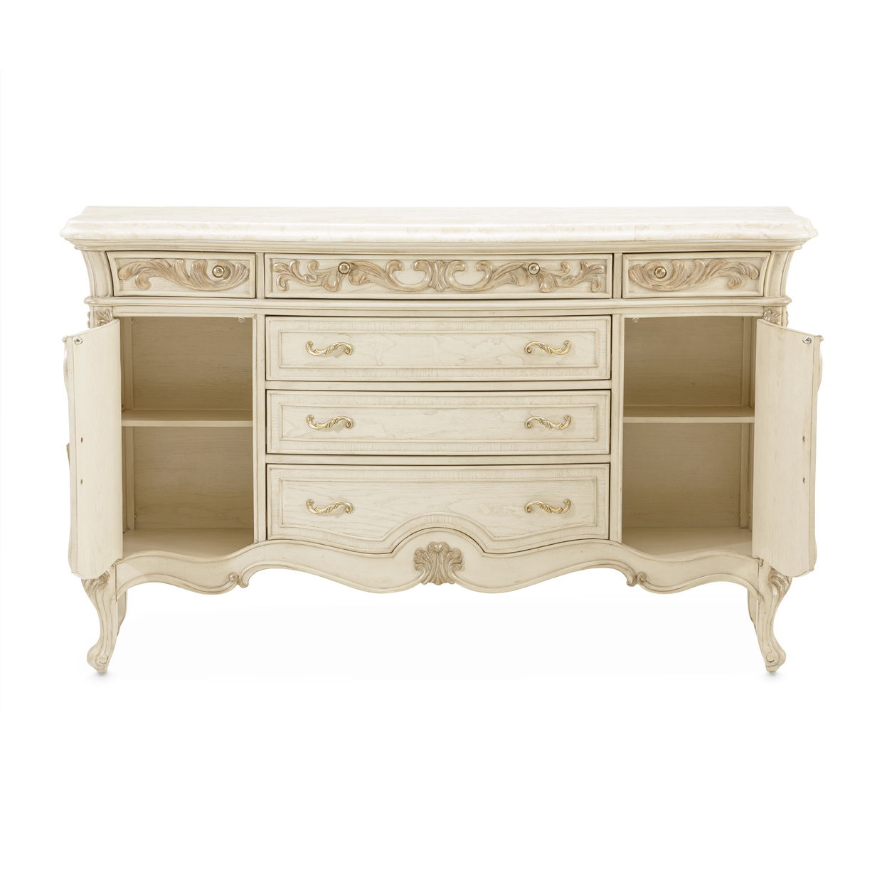 Traditional form and function combine to bring you this regally opulent server that will accentuate any room. The Platine de Royale Sideboard offers two cabinets, six drawers, a velvet lined caddy and top drawers accented with antique platinum leaf finished designs.