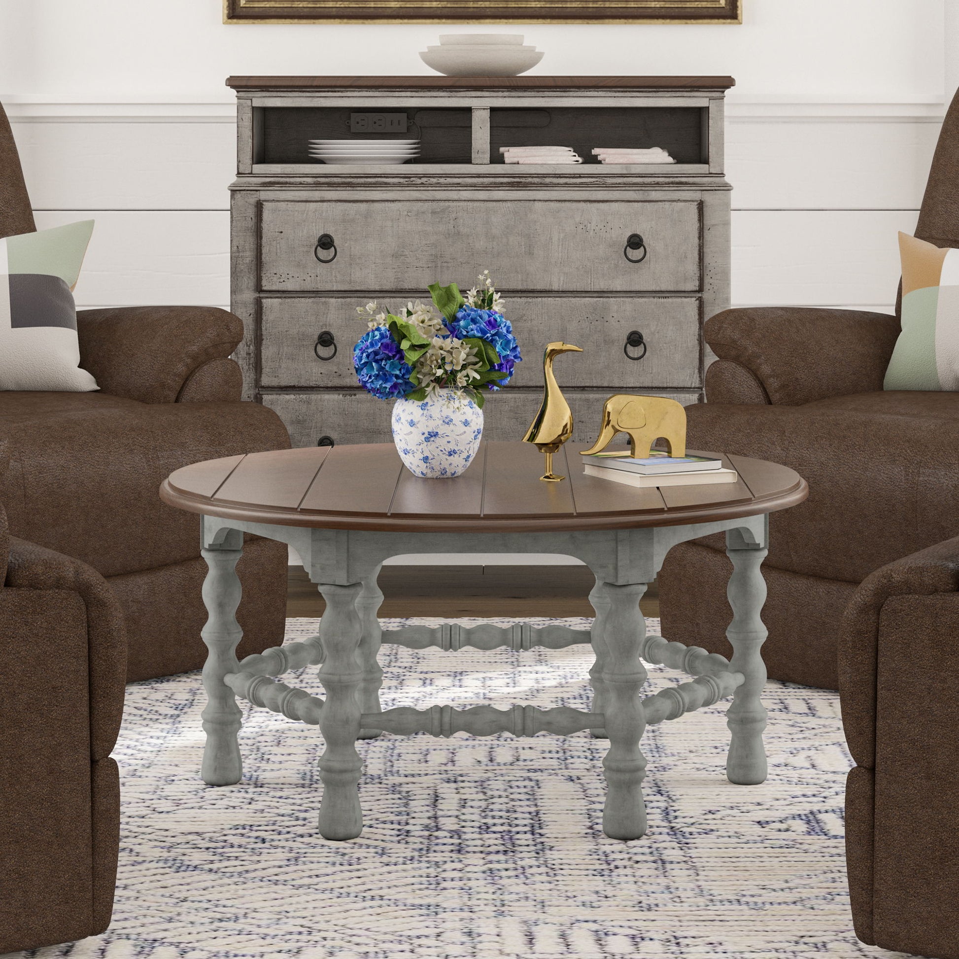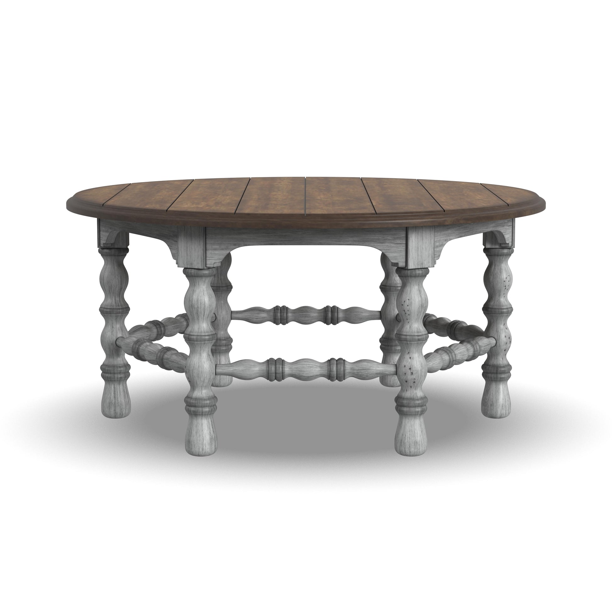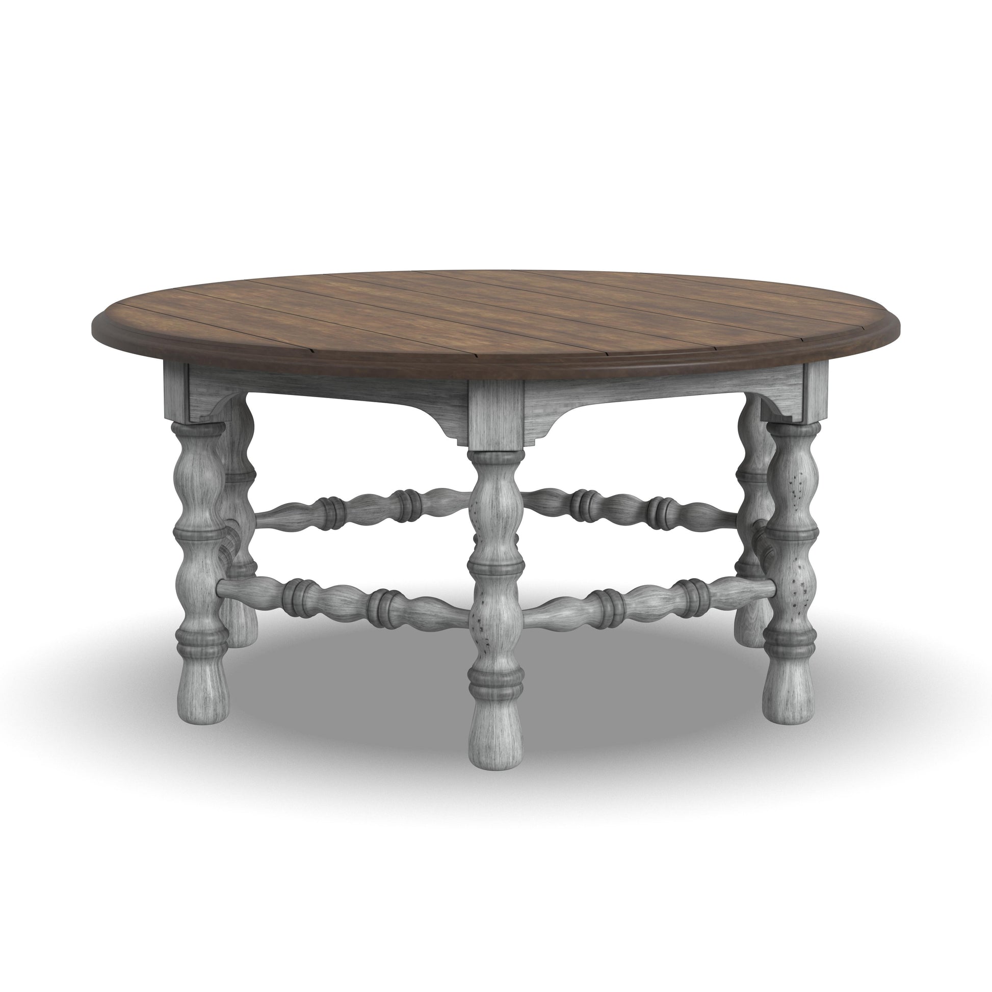 Add warmth and character to your living room with the Plymouth round coffee table, designed with cottage-inspired details such as intricate spool-turned legs and trestles. This table’s distressed, planked top provides ample area for displaying books or décor or serves as the ideal spot to hold drinks and appetizers while entertaining. A weathered graywash finish is contrasted by a medium brown top for a well-worn vintage look.