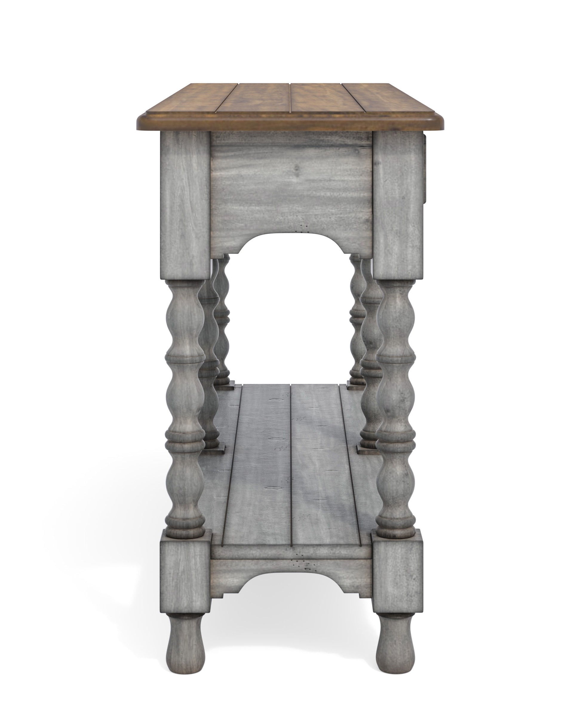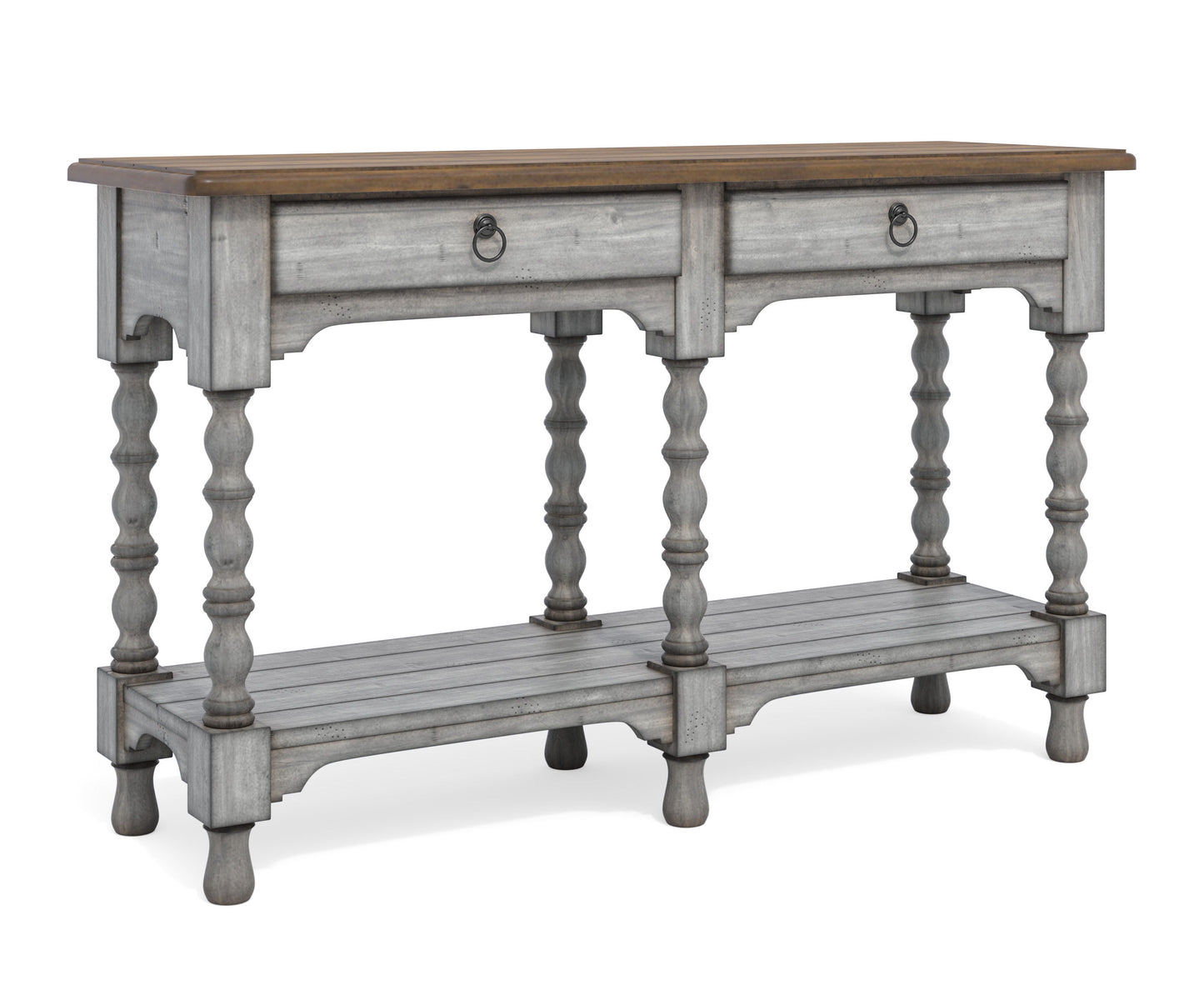 Use as a stand-alone piece along a wall or accent a sofa or loveseat with the inviting look of the Plymouth sofa table with drawers. Featuring a planked top, two drawers with ball-bearing slides and an open lower shelf, this table offers plenty of storage and display area to showcase your most treasured photos and décor. A weathered graywash finish is enhanced by the medium brown table top, while spool-turned legs and gunmetal pulls add cottage-inspired warmth and character.