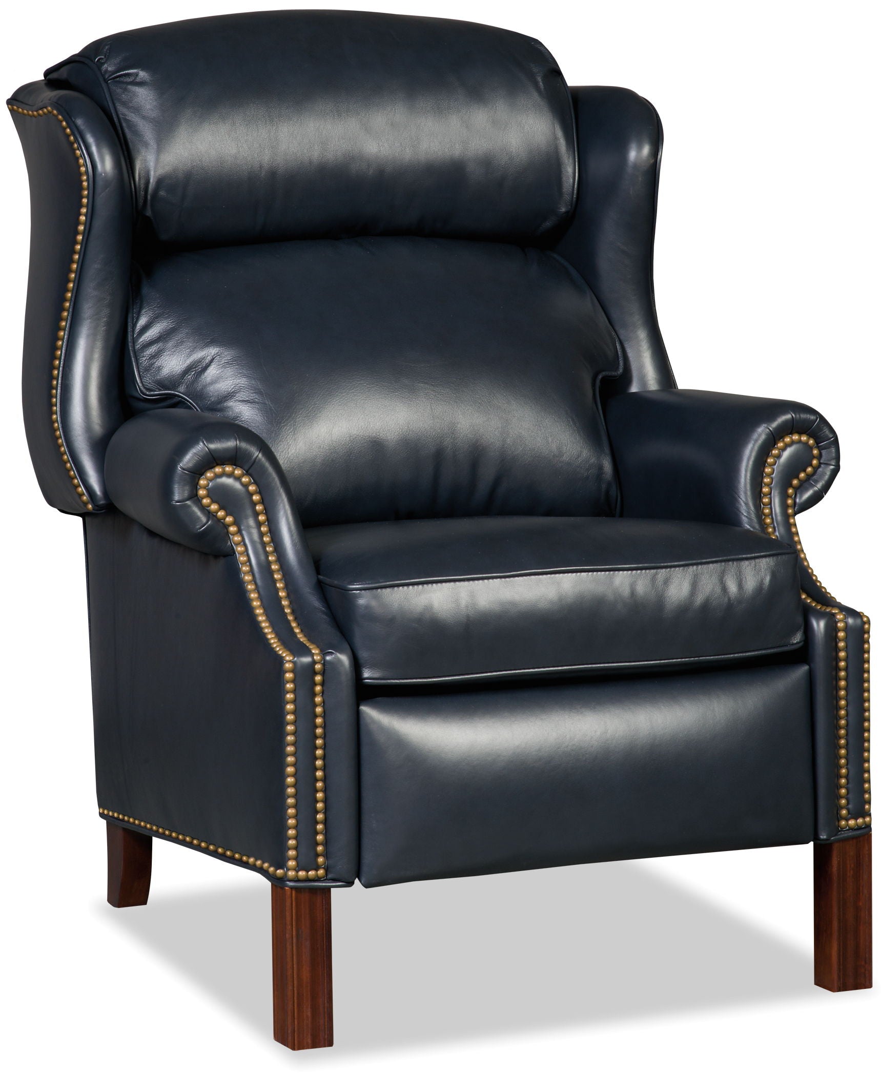 The Presidential Reclining Wing Chair W/Brass Nails is offered in hundreds of leather options and includes a standard nailhead trim #9 in French natural finish. Other decorative nailhead finishes are available. Comes with a standard mahogany finish but other finishes are available. It features a semi-attached seat back and a premier down seat. Power recline is available for an upcharge.