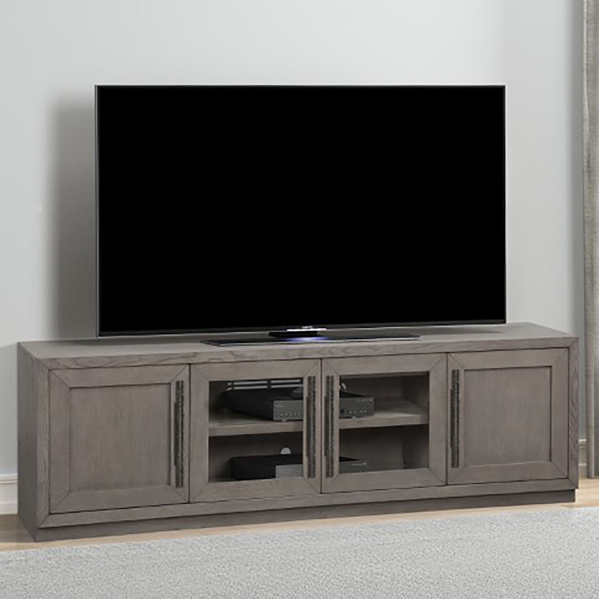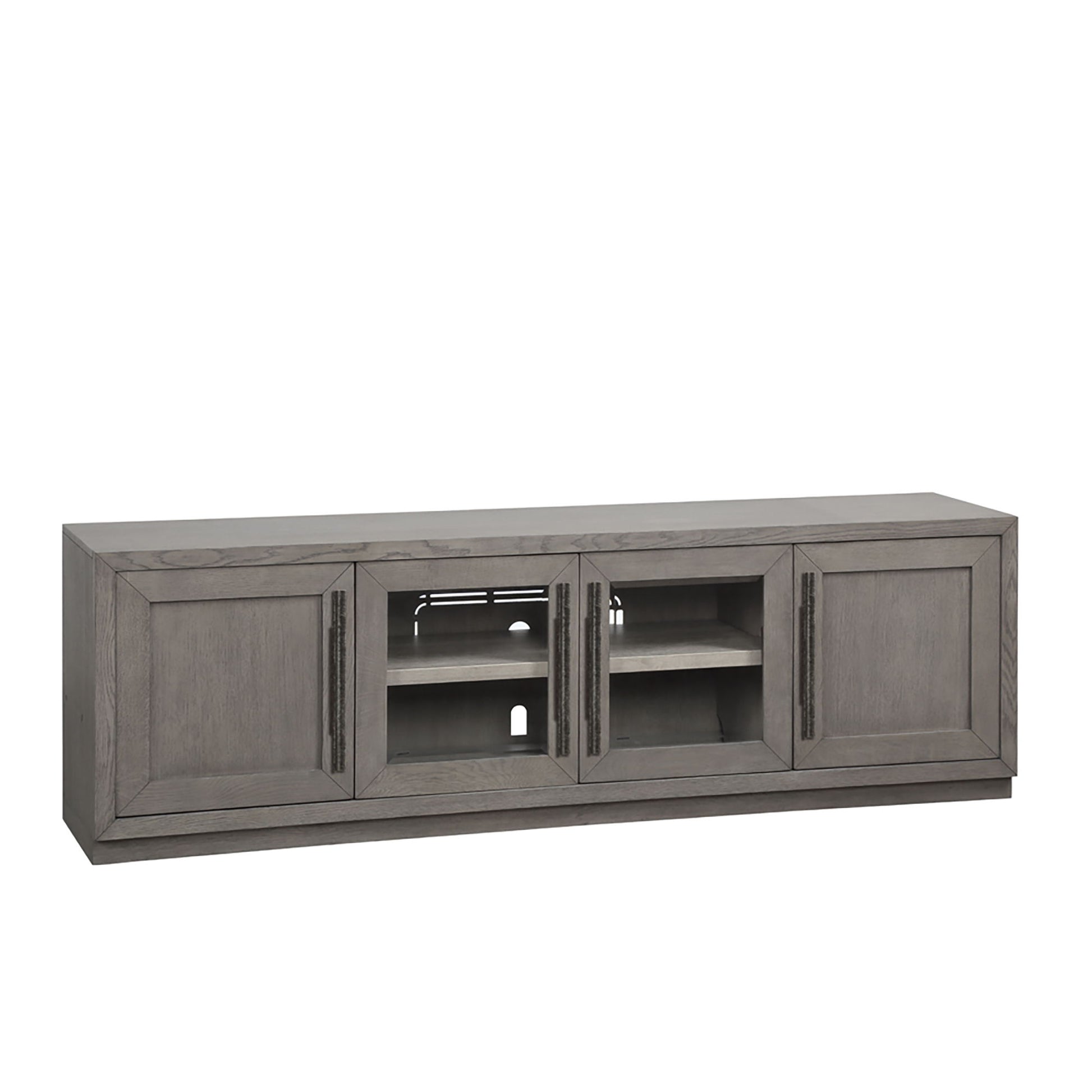 Understated and elegant, this 76-inch Door Console from the Pure Modern collection will elevate any living area. Its clean lines and mitered corners are highlighted with straight-grain white oak veneers in a soft Moonstone finish and accented with bold custom bar-pull hardware in Brushed Nickel. Its two center doors feature beautiful glass fronts, while behind all four doors you'll find an adjustable shelf and generous storage for electronics and components. This gorgeous Door Console is ideal for displaying even the largest televisions, up to 82-inch in size.
