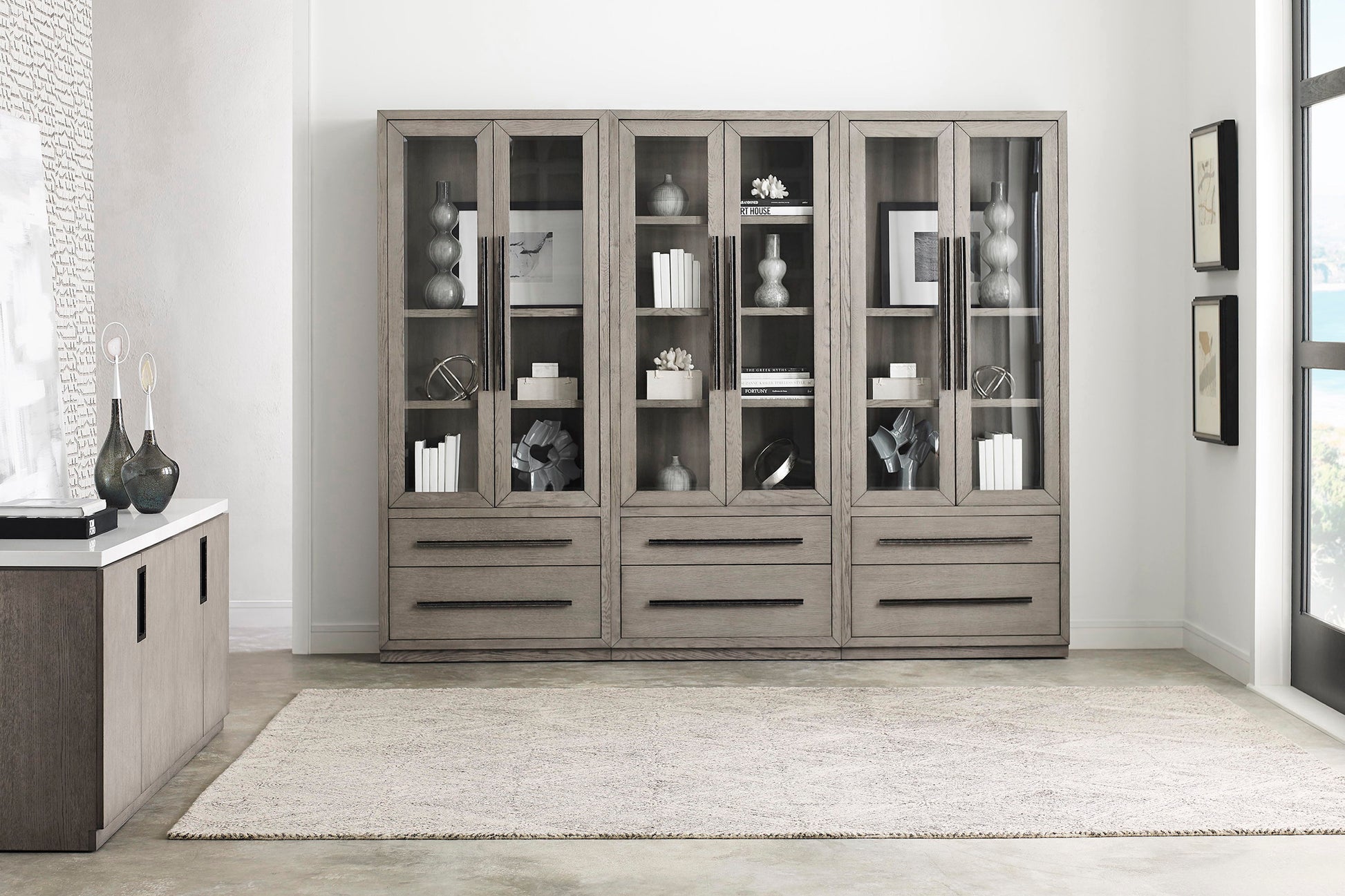 Part of the FREEStyle Wall System, this 36-inch Glass Door Cabinet from the Pure Modern collection adds an element of modern sophistication to any space. Behind its two glass doors, three glass-framed shelves offer modern display options while two lower drawers provide hidden storage. Its innovative design can be used on its own or paired with other components. Choose coordinating bookcases, cabinets and media display pieces to create your own uniquely configurable wall system to fit your room and lifestyle. A soft Moonstone finish highlights the cabinet's linear white oak veneers, plinth base and angular proportions and is complemented by custom bar-pull hardware in Brushed Nickel.